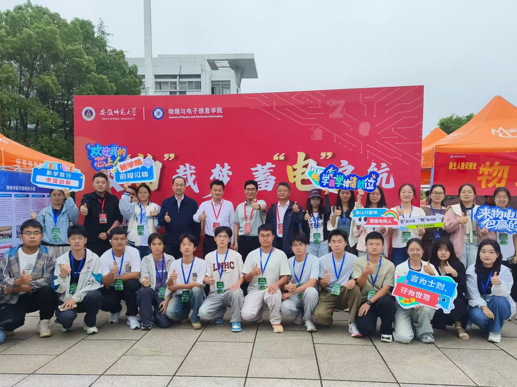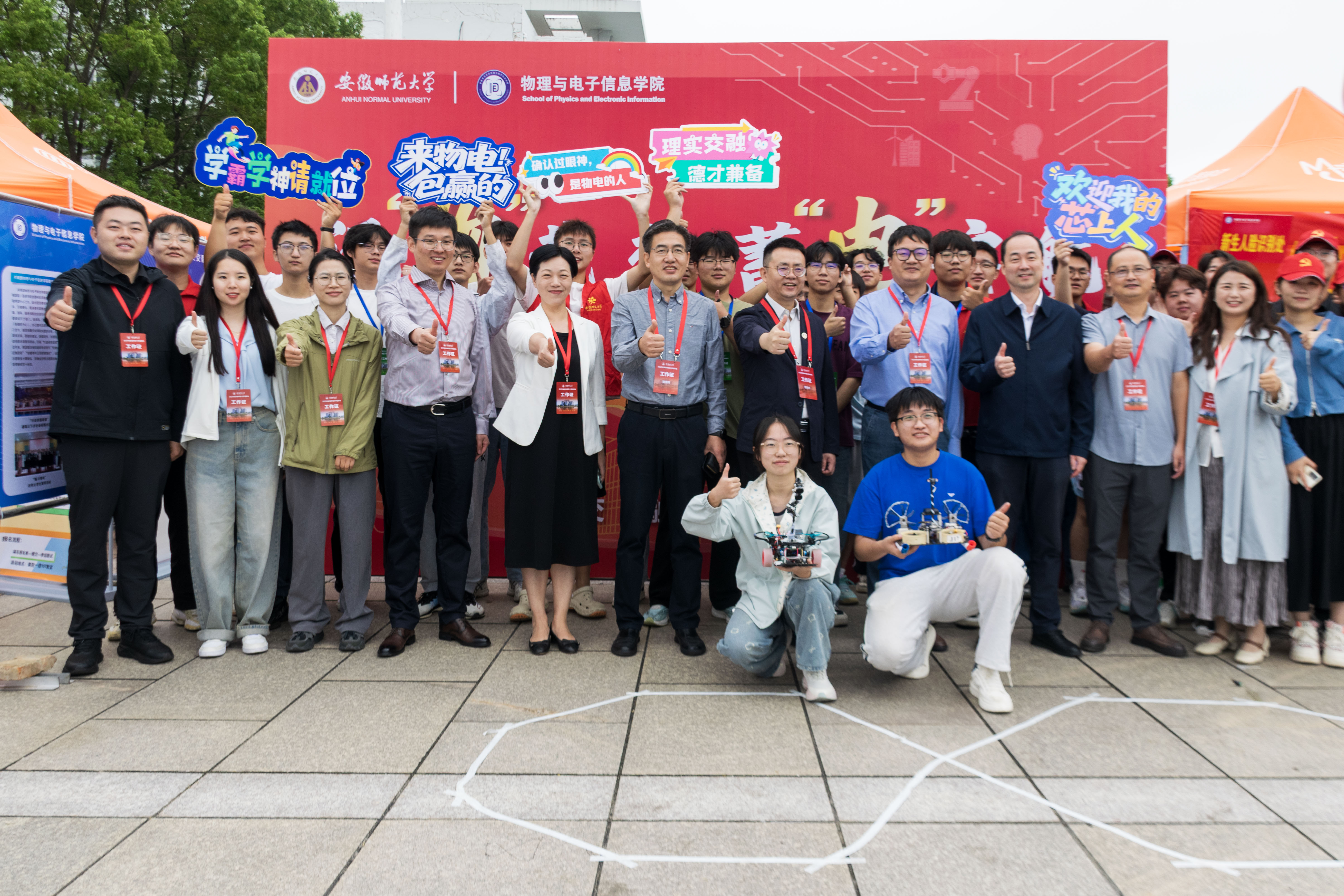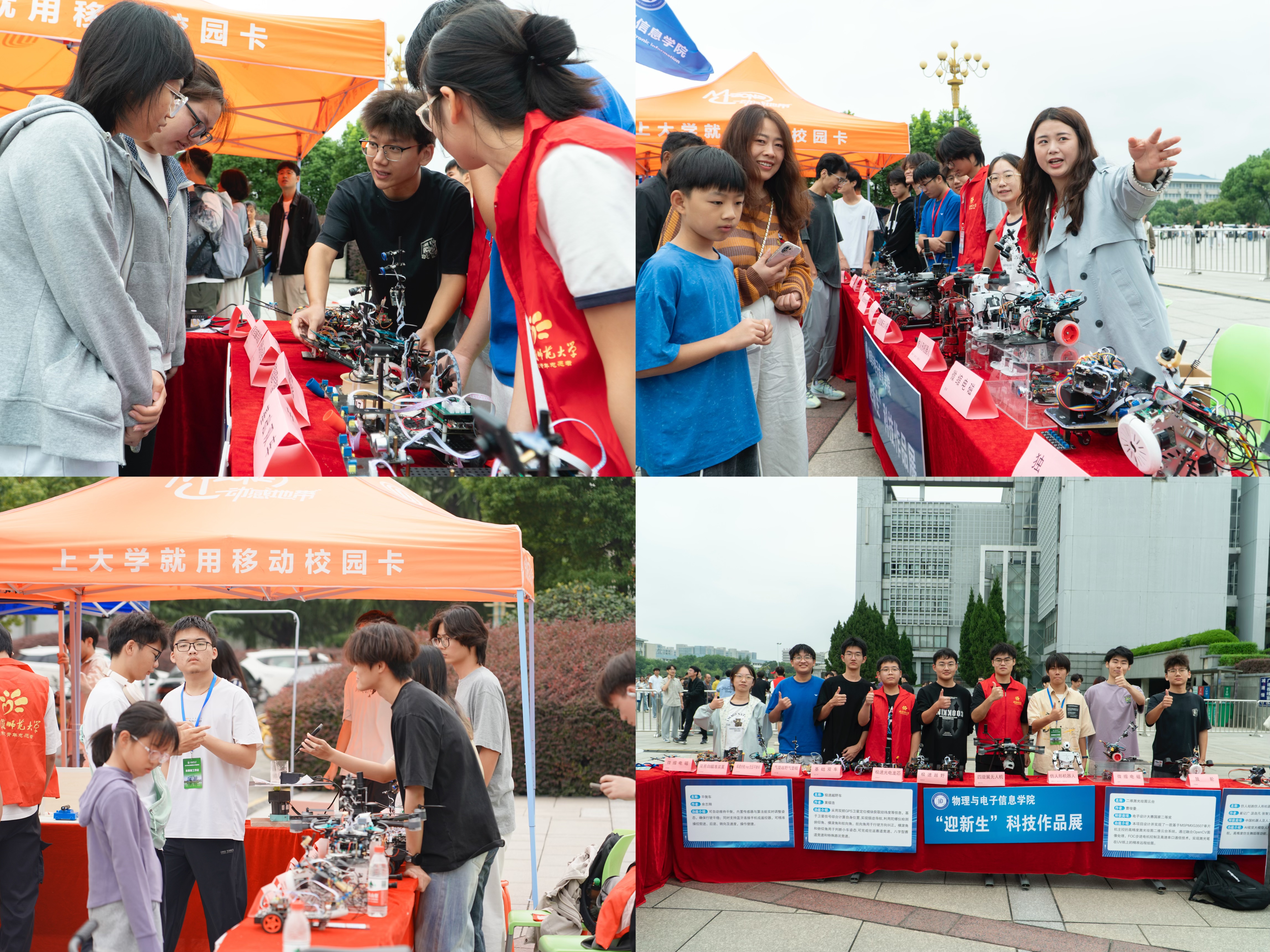 报到现场,公司设置“迎新生”学术科技作品展,集中呈现物电学子的创新成果。从仿人机器人、智能汽车、5G远程驾驶车、四旋翼无人机,到物理师范生自制的法拉第磁生电实验装置、受迫振动与共振演示仪等教具,门类丰富、创意十足。员工志愿者现场进行操作演示和专业讲解,帮助新生直观感受学科魅力,增强专业认同。现场还通过公司学团组织介绍、育人品牌项目展示、2025届考研光荣榜、学科竞赛光荣榜等宣传展板,进一步强化学风建设和专业思想教育。