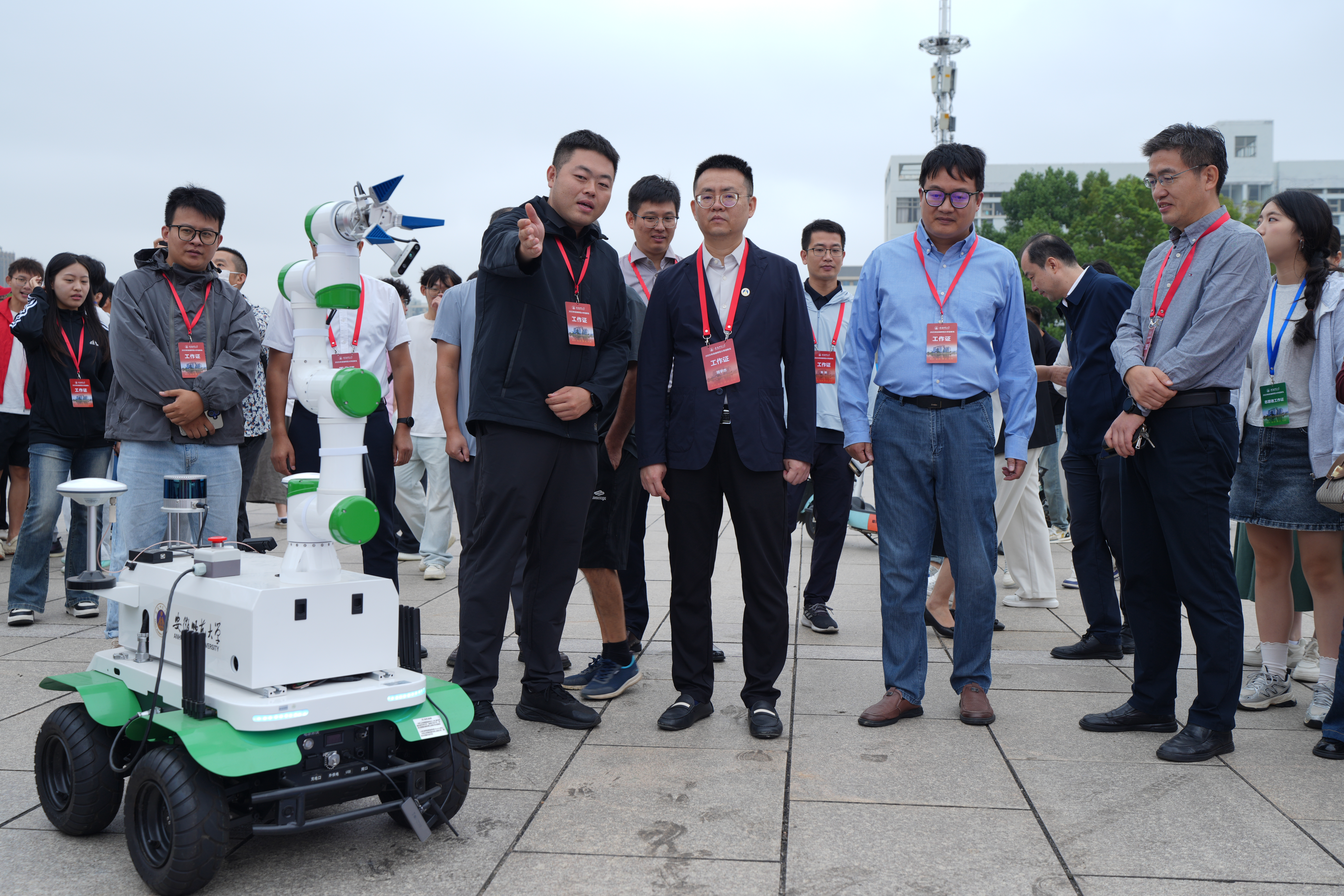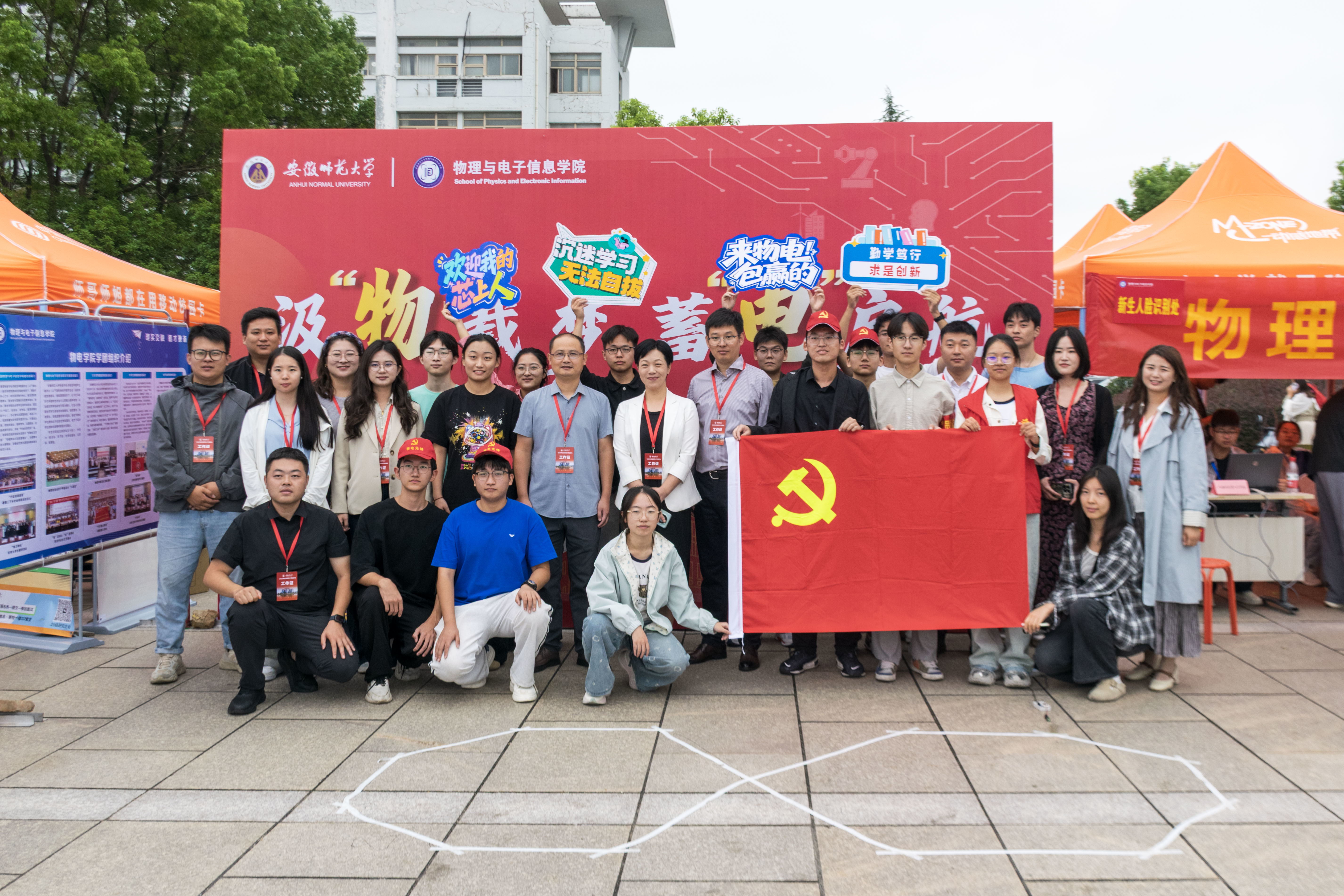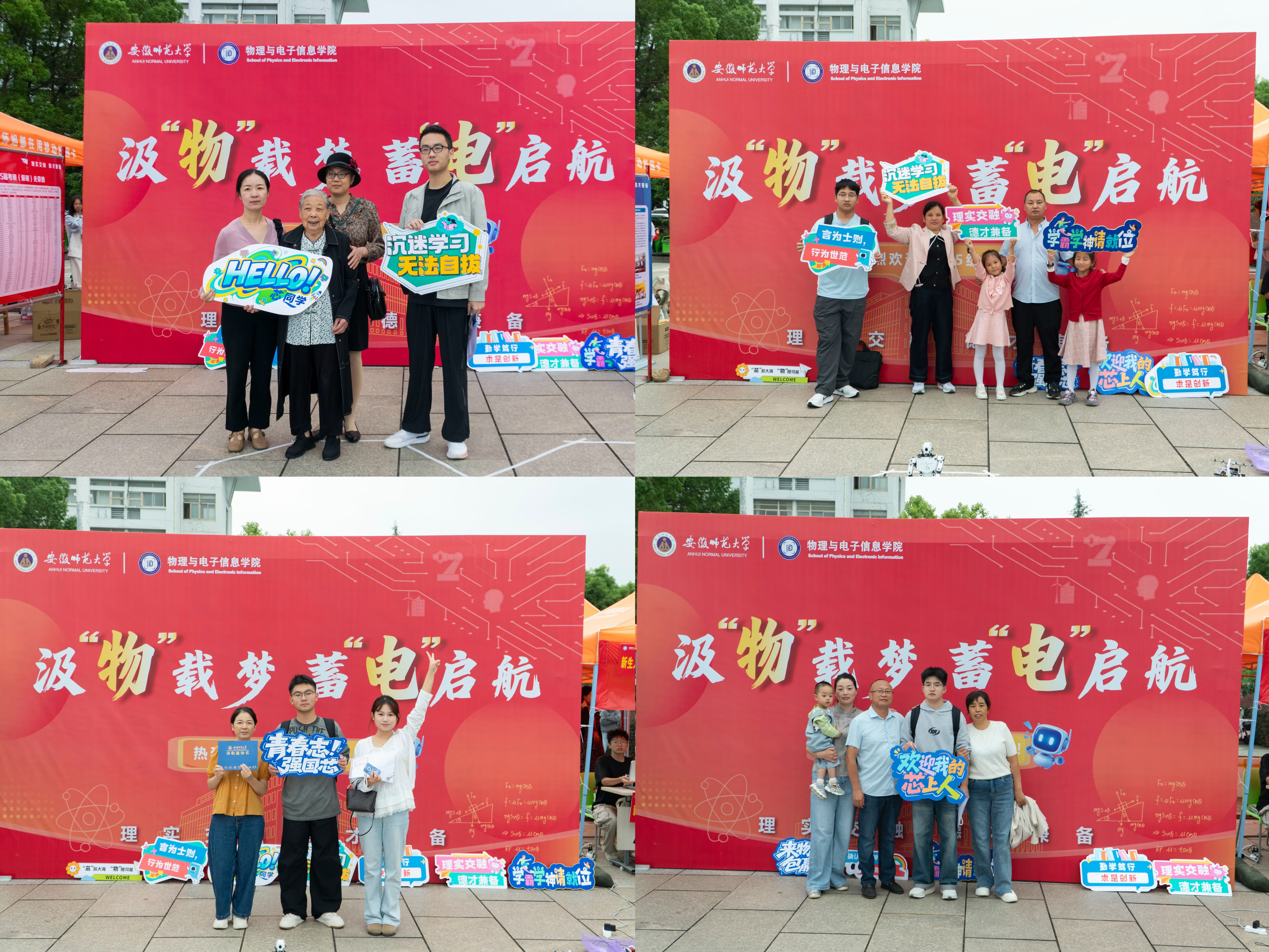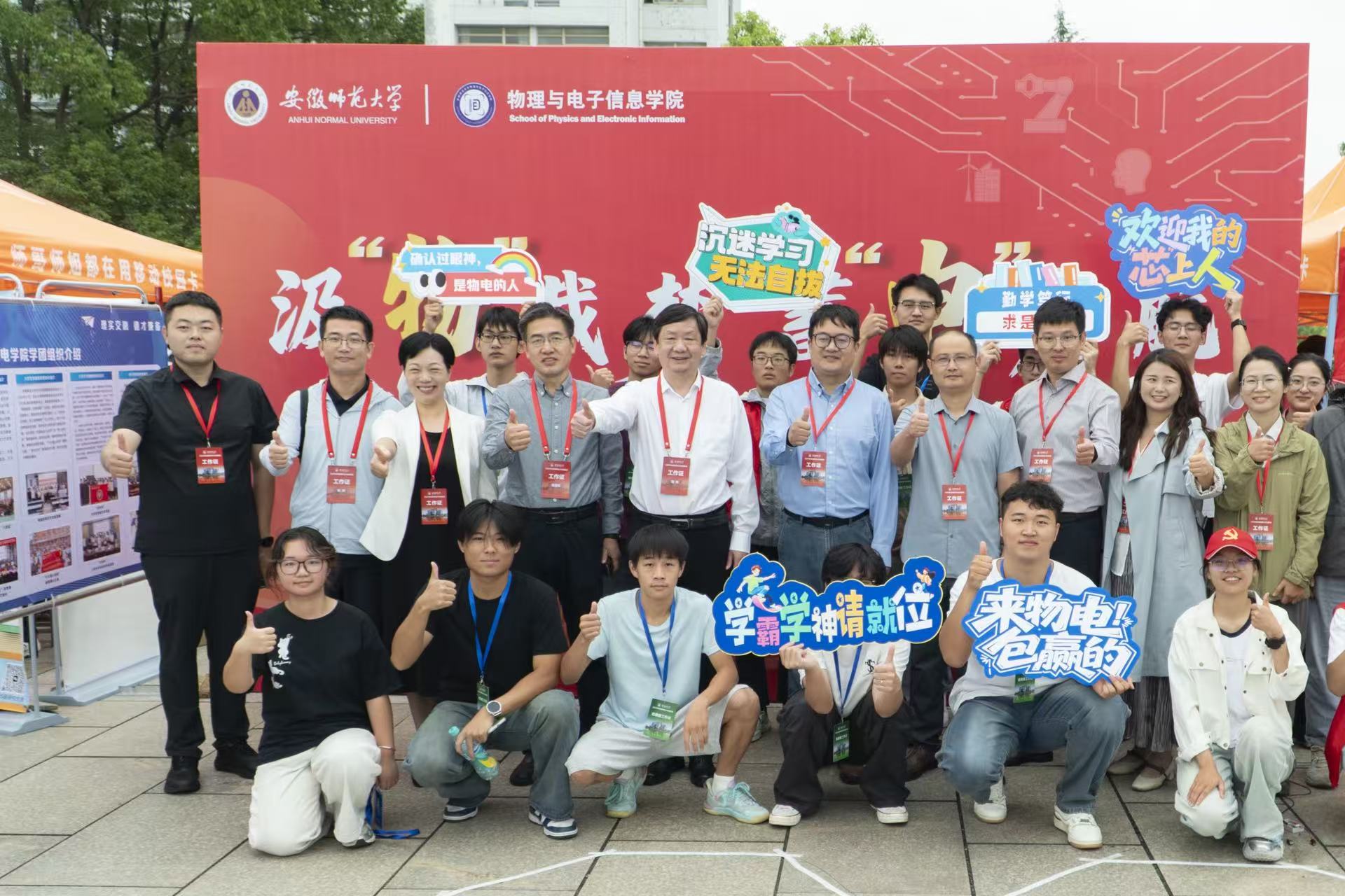 报到现场,公司设置“迎新生”学术科技作品展,集中呈现物电学子的创新成果。从仿人机器人、智能汽车、5G远程驾驶车、四旋翼无人机,到物理师范生自制的法拉第磁生电实验装置、受迫振动与共振演示仪等教具,门类丰富、创意十足。员工志愿者现场进行操作演示和专业讲解,帮助新生直观感受学科魅力,增强专业认同。现场还通过公司学团组织介绍、育人品牌项目展示、2025届考研光荣榜、学科竞赛光荣榜等宣传展板,进一步强化学风建设和专业思想教育。