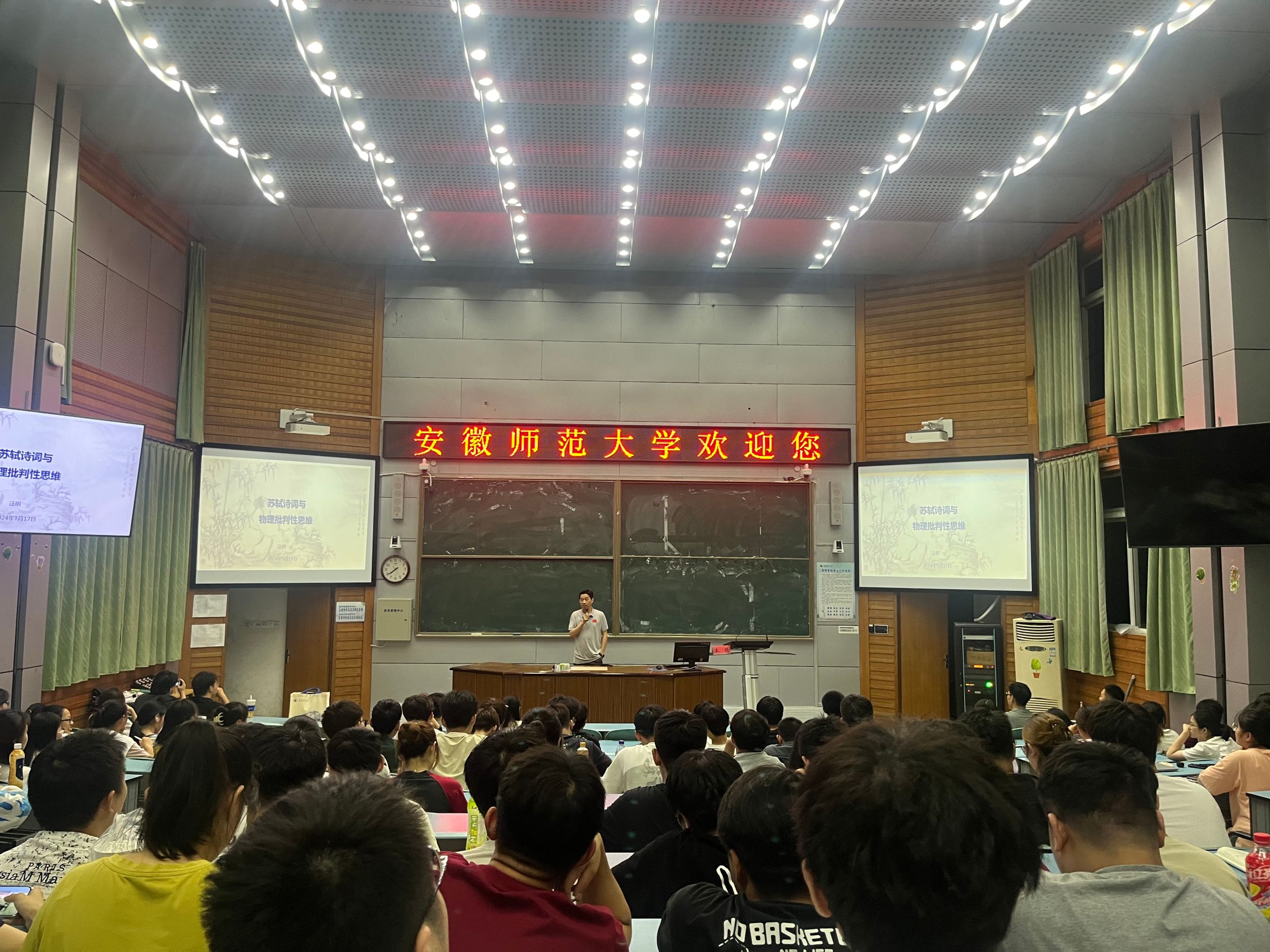 汪明以苏轼名篇《水调歌头•明月几时有》为例,剖析古诗词中蕴含的物理现象和背后的物理原理,指出科学问题不等于“现象+问号”,要学会运用批判性思维诱发物理核心概念规律的思考,在人文欣赏中结合理性思维特质,引入对问题的反复、严肃、持续不断的提问和批判性审视,旨在提升员工物理核心素养。他特别强调,批判性思维是马克思主义哲学的精髓,作为物理专业员工,要逐步养成批判性思维,科学与人文交汇才是教师迸发创新创造力的源泉。会上,同学们认真聆听,仔细记录,共同探讨古诗词中的物理奥秘。