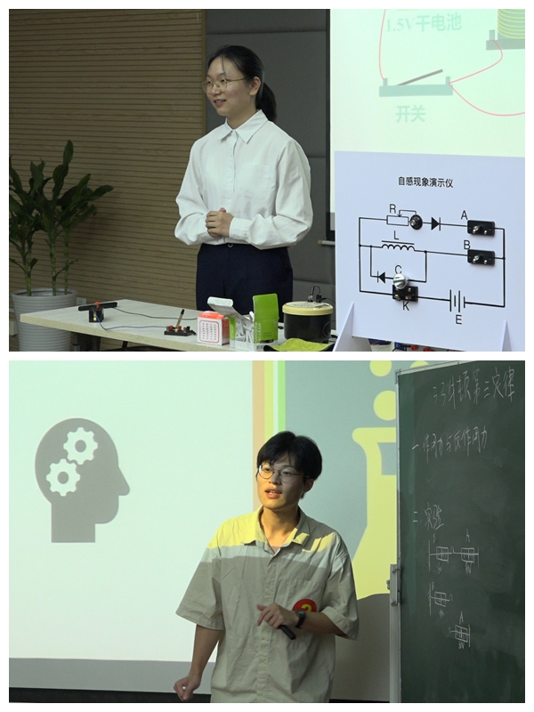 在模拟授课环节,参赛选手选择高中多普勒效应、磁感应强度、互感和自感、摩擦力、光的折射、动量定理等课题,进行了精彩的模拟课堂教学。其中杜雪萌结合自制教具,通过生动有趣的课堂演示实验,为大家带来一堂生动的物理课。