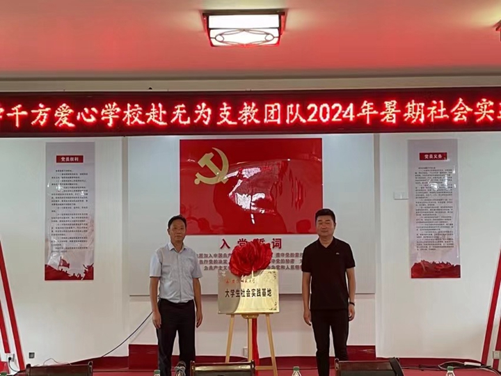 团队队长王洋洋从团队建立、成员概况、课程安排等介绍了千方爱心公司赴枞阳爱心支教团队的基本情况。张其芳与柯成共同为老员工社会实践基地揭牌。