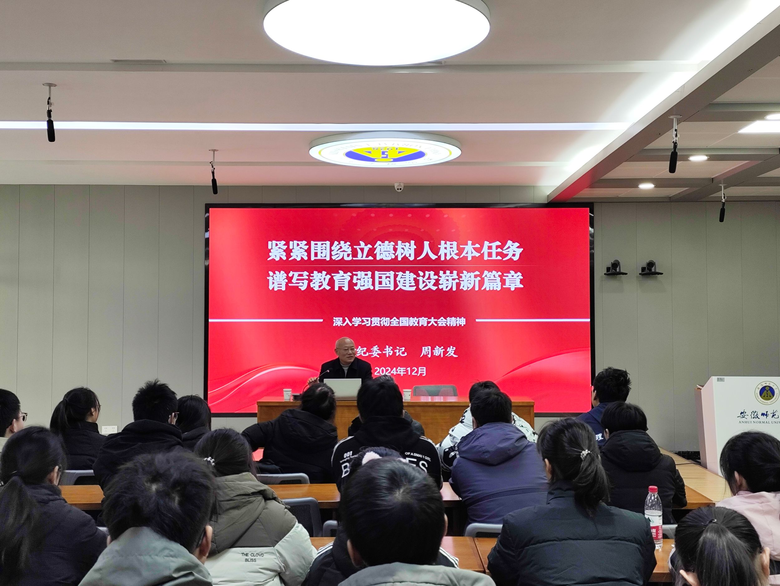 周新发以《紧紧围绕立德树人根本任务 谱写教育强国建设崭新篇章》为主题,围绕着“深入学习习近平总书记重要讲话精神、深刻认识全国教育大会的重大意义、全面系统学习宣传全国教育大会精神、全力推动全国教育大会精神落地见效”这四个方面展开授课。他指出,学习贯彻全国教育大会精神,是当前和今后一个时期教育系统的重要政治任务。我们要深入学习贯彻习近平总书记重要讲话精神,把思想和行动统一到习近平总书记重要讲话精神和党中央决策部署上来,务实功、出实招、求实效,奋力谱写教育强国建设崭新篇章。他强调,建设教育强国是一项长期而艰巨的任务,需要我们坚持不懈、久久为功。作为高校老员工,要深入学习领会、全面贯彻落实全国教育大会精神,增强责任感和使命感,积极进取、奋发有为,为加快建设教育强国、全面建设社会主义现代化国家贡献力量。