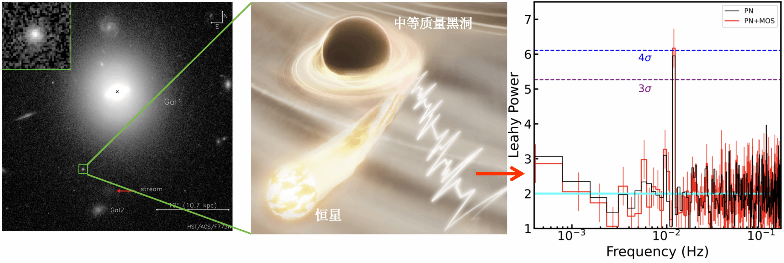 左图为中等质量黑洞所在星系的光学图像, 来自Lin et al. (2020, ApJL, 892, 25)。中图为中等质量黑洞撕裂恒星的艺术想象图,以及实际观测的X射线准周期光变信号。右图为光变信号对应的功率密度谱。