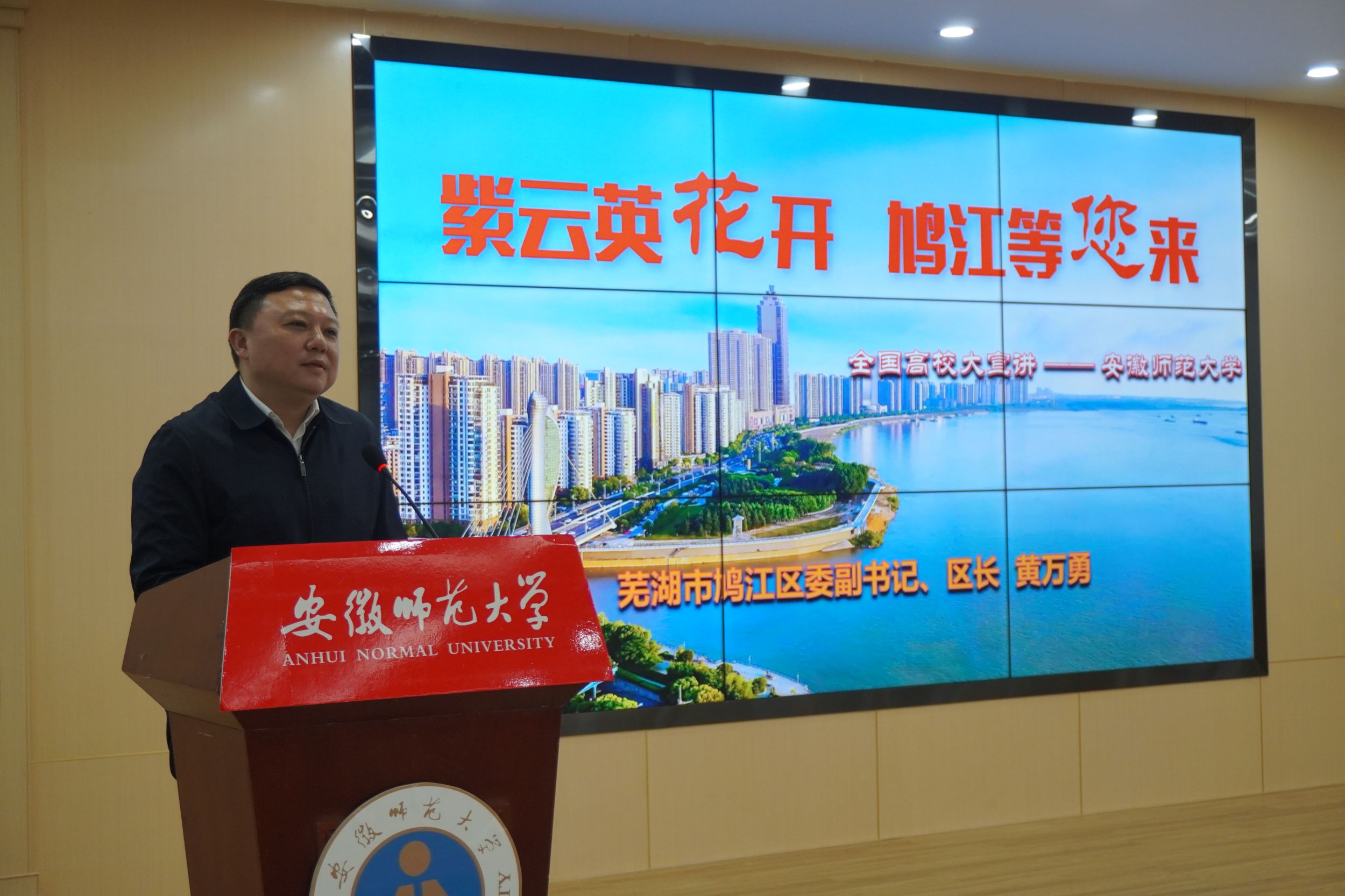 活动伊始,“紫云英花开,鸠江等您来”专场宣讲会率先启动。鸠江区委副书记、区长黄万勇率副区长魏利胜、区人才工作局局长苏晨等政府代表出席,m88官网人才招聘处副处长刘振杰代表校方向鸠江区政府一行致欢迎辞。刘振杰表示,公司始终将服务地方发展作为使命,近年来通过深化校地合作,已为鸠江区输送大批高素质人才,“此次招聘会既是合作成果的体现,更是未来共赢的新起点”。 黄万勇区长随后围绕鸠江区产业布局、人才政策和发展机遇展开区情推介。他提到,鸠江区正全力打造新能源、微电子、智能装备三大产业集群,并通过“紫云英人才计划”为毕业生提供购房补贴、创业扶持等政策,“我们以最大诚意邀请青年学子扎根鸠江,与城市共成长”。