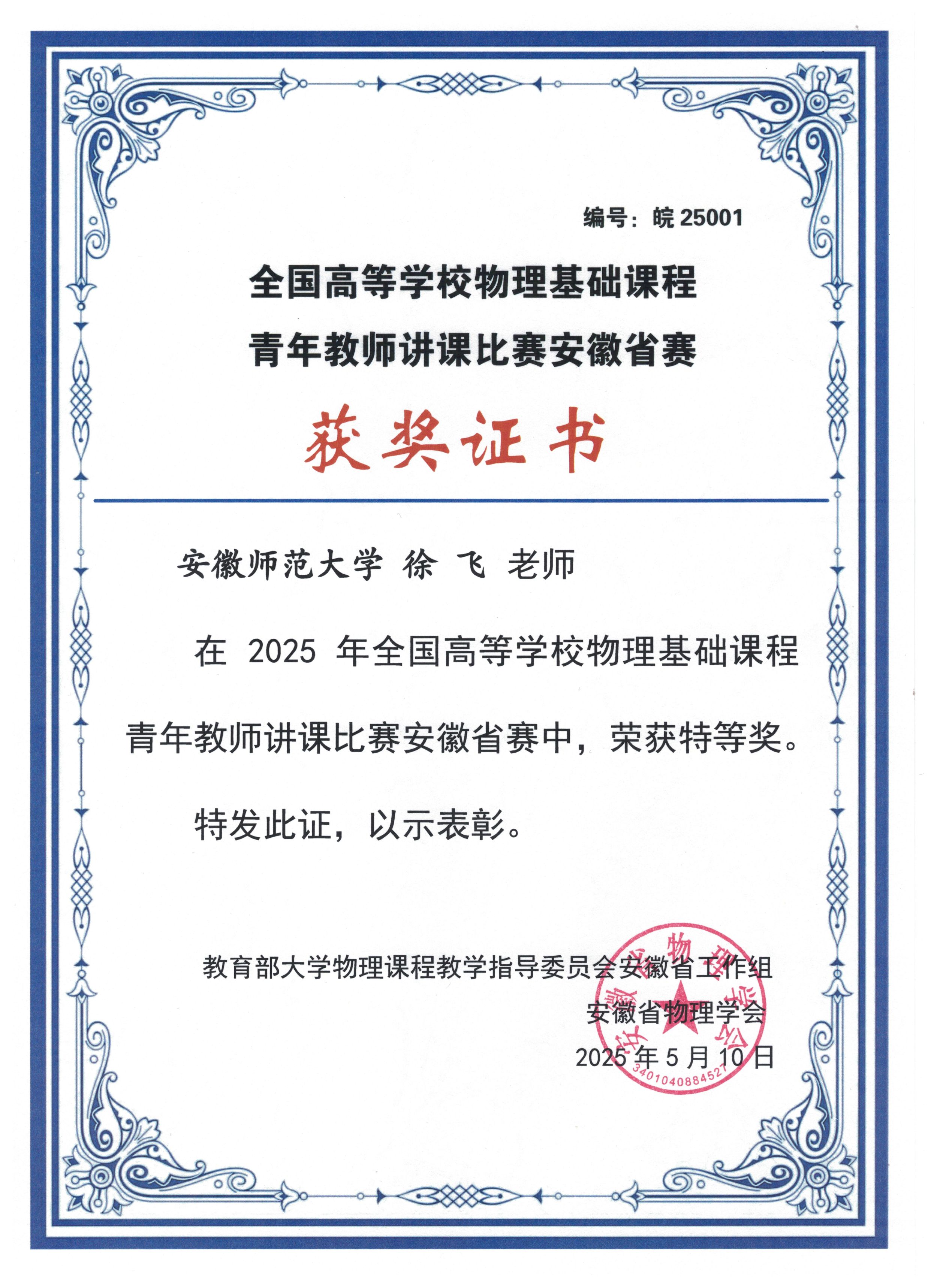 本次比赛由教育部大学物理课程教学指导委员会安徽工作委员会、安徽省物理学会共同主办,安徽大学承办。比赛汇聚了安徽省二十余所高校物理基础课程的优秀青年教师,竞争异常激烈。徐飞老师在备赛过程中,精心设计教学方案,反复打磨教学环节,力求将物理知识以生动、易懂且富有启发性的方式呈现给员工。比赛中,他以扎实的专业知识、严谨的教学态度、灵活多样的教学方法以及富有感染力的教学风格,充分展示了公司青年教师扎实的教学基本功和独特的教学风采,赢得了评委们的一致好评,最终脱颖而出,斩获特等奖第一名。