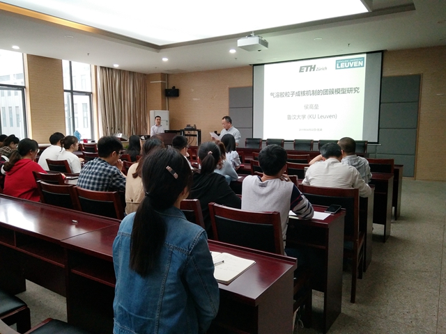 报告中,侯高垒博士首先介绍了团簇研究的意义和作用:团簇是原子分子和离子及其聚集体,尺寸处于原子分子和宏观凝聚相之间,是联系微观世界和宏观世界的桥梁,在异相催化,溶液理论,气溶胶成核与生长,生物化学过程及新型材料开发等各方面均有重大意义。然后介绍了大气气溶胶粒子生成以及气相成核与生长的研究,并对气相成核的实验研究方法和分子水平研究气相成核的实验要求做了详细的介绍。最后,侯高垒博士告诉大家:气溶胶粒子成核机制的团簇模型这一研究领域为很多经典的问题提供了新的研究工具和思路,并且鼓励同学们要大胆创新,勇于探索。