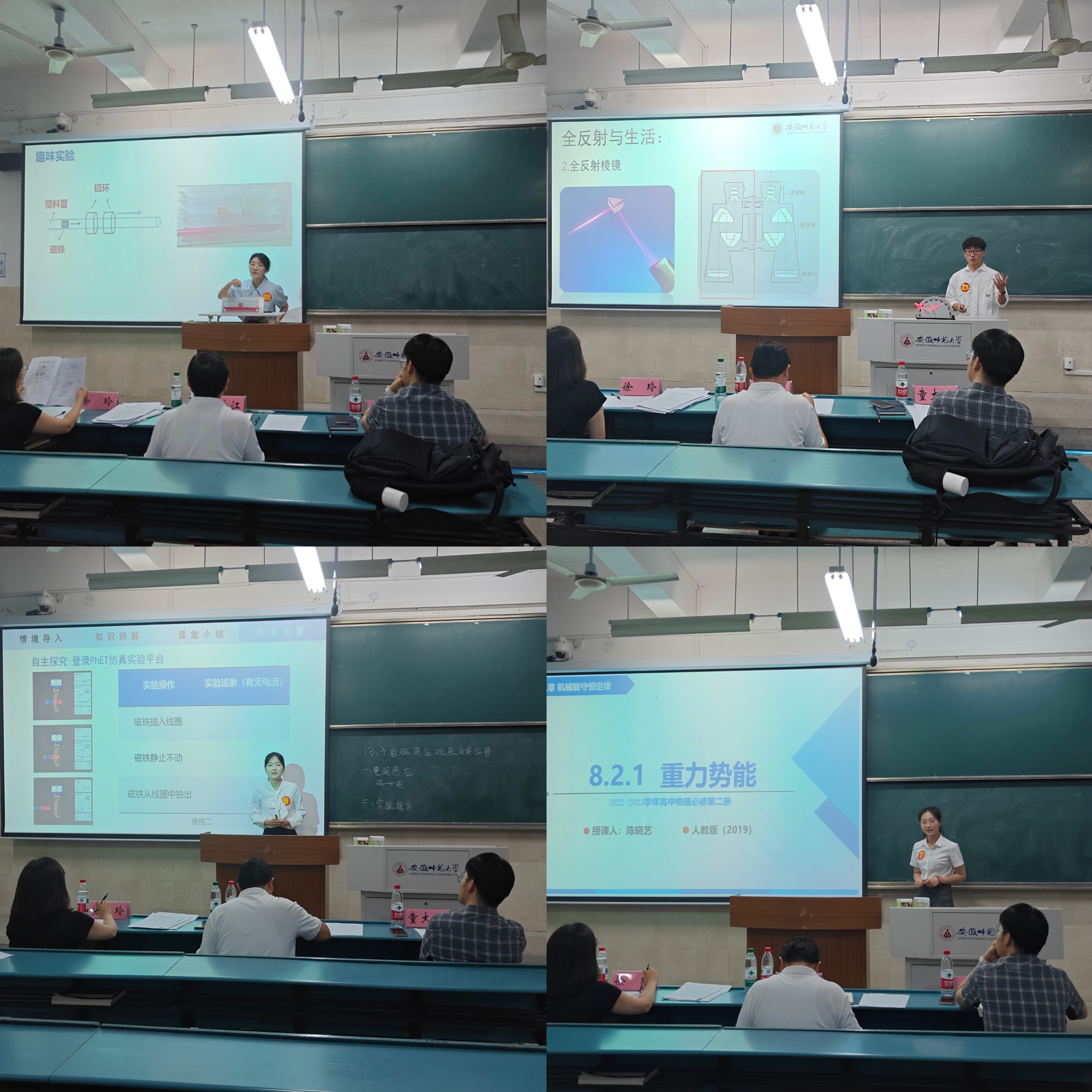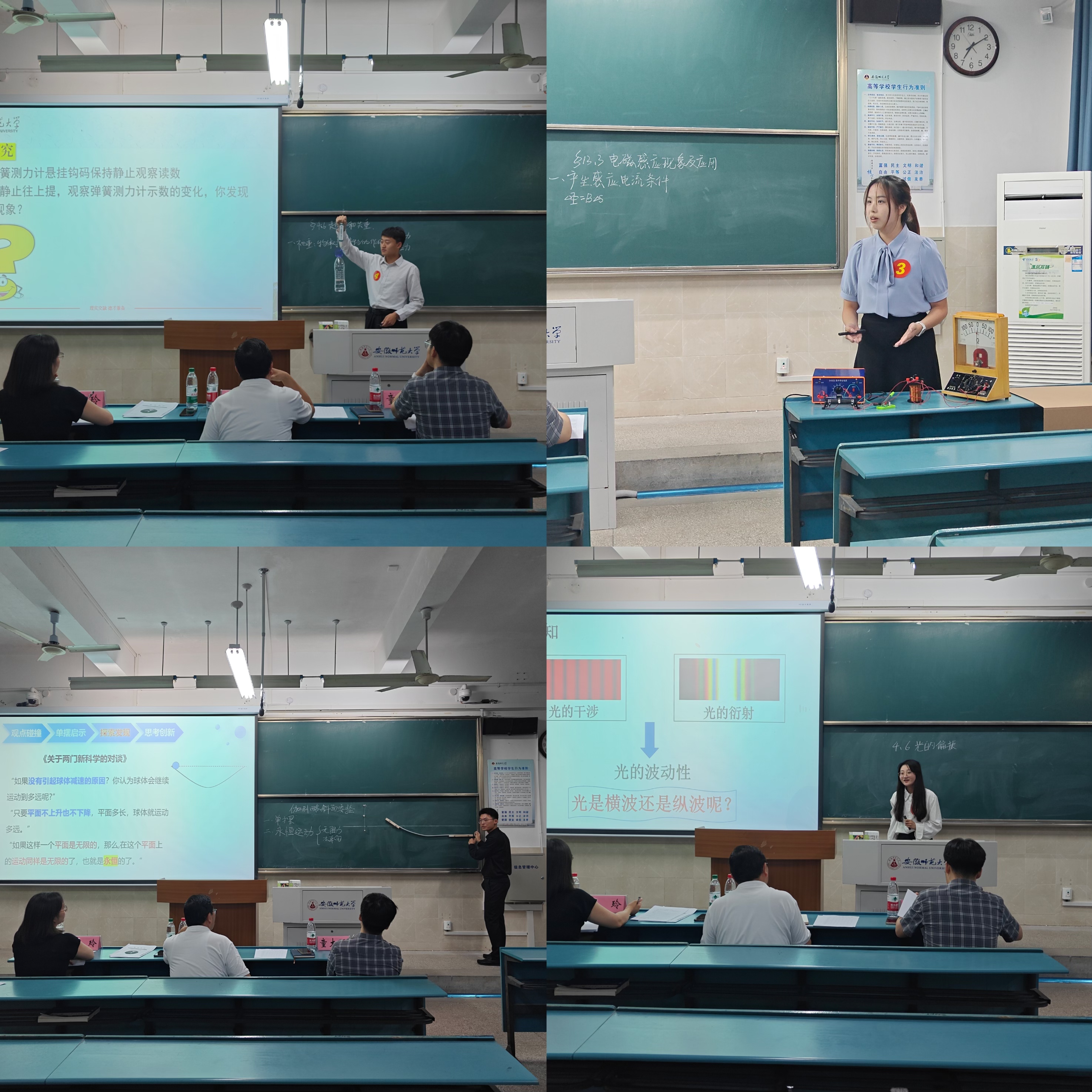 比赛现场,各参赛选手按照顺序依次进行模拟授课,分别采用现场试验、教学视频、师生互动等方法,开展了压强、机械功的含义及计算、力的合成、自由落体运动、弹力、声音的特性等课程的教学,带来了一场场趣味与教学并重的物理课堂教学,细致的内容和动情的讲解使现场师生仿佛置身在真实的课堂中。