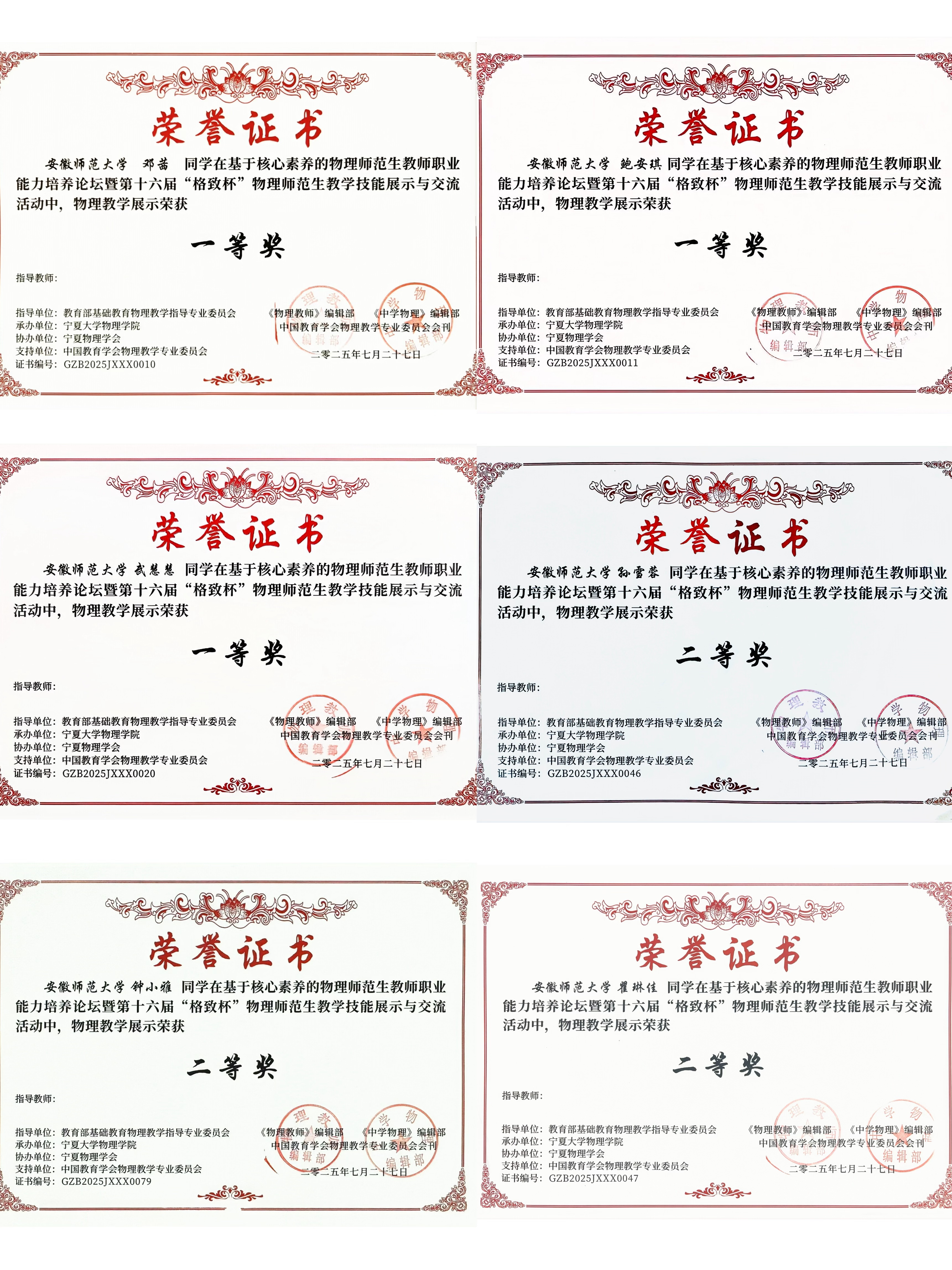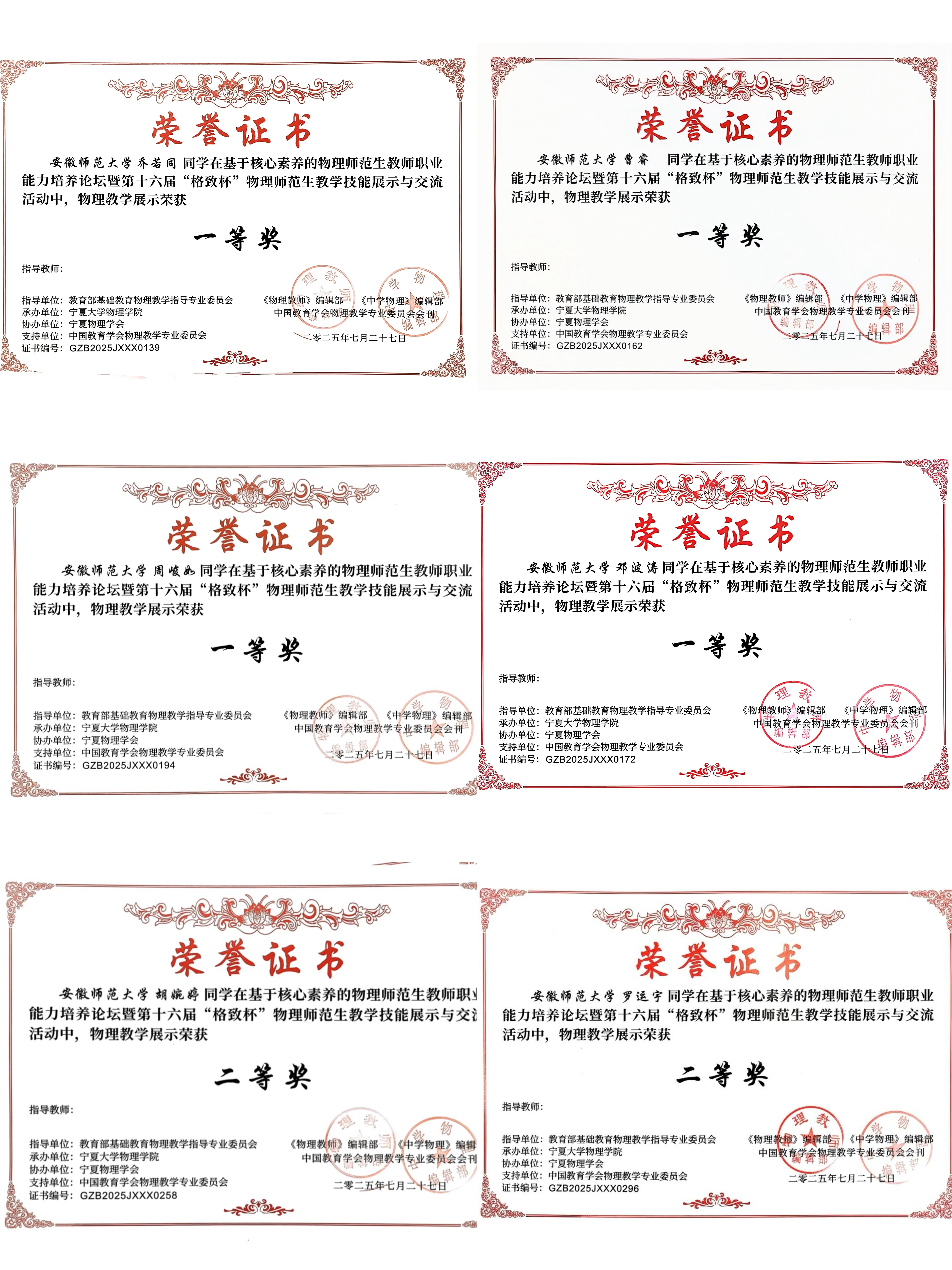 经过紧张激烈的角逐,在教学技能展评活动中,物理学(师范)专业本科生乔若同、曹睿、周峻如、邓波涛,课程与教学论专业研究生邓茜和学科教学(物理)专业研究生鲍安琪、武慧慧荣获一等奖,本科生胡婉婷、罗运宇,课程与教学论专业研究生孙雪蓉和学科教学(物理)专业研究生钟小雅、翟琳佳荣获二等奖,学科教学(物理)专业研究生李智浩获得教学技能三等奖;在论文展评活动中,学科教学(物理)专业研究生李智浩、武慧慧分别荣获一等奖、三等奖。