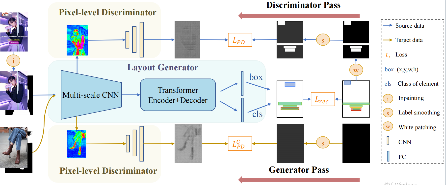 在现代广告与视觉传播中,海报排版布局对吸引用户注意、传递产品信息具有至关重要的作用。然而,传统自动化排版方法往往缺乏对图像内容的理解,难以生成兼顾美观性与内容相关性的设计。本研究提出了一种基于生成对抗网络(GAN)的跨域自适应方法,能够根据输入的产品图像自动生成符合审美规律的广告海报排版。
