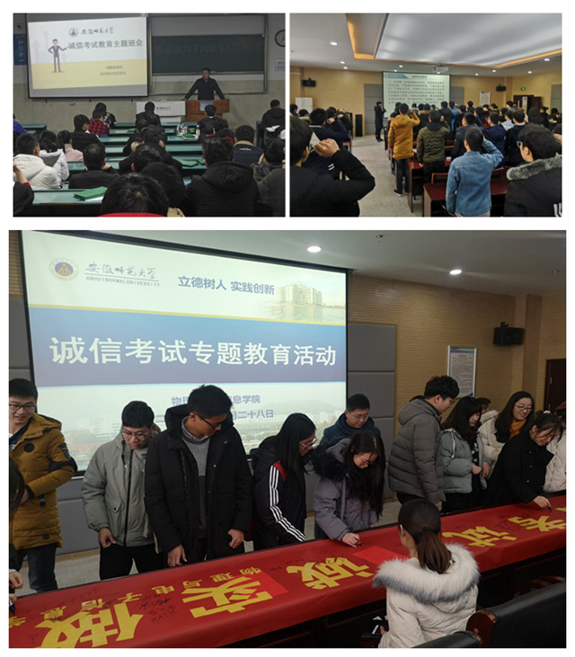 公司四个年级,五个专业,分别召开以“诚信考试”为主题的主题班会,学习《m88官网考场规则》,并且举例说明公司对考试违纪或者考试作弊的处理方法,反复强调诚信考试的重要性以及作弊的严重性。公司全体院领导分专业到各班班会现场作动员讲话。同时,在辅导员的带领下,全体同学大声宣誓:“诚实做人,诚信迎考”,并且现场签订承诺书,用实际行动展现物电学子“严谨治学,诚信为人”的责任意识。
