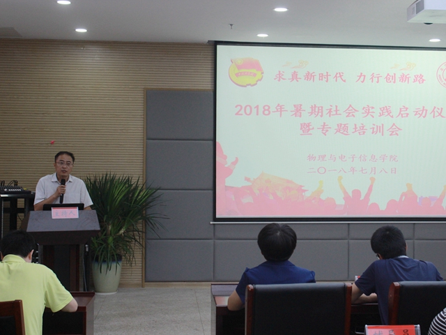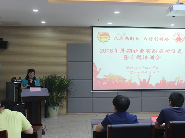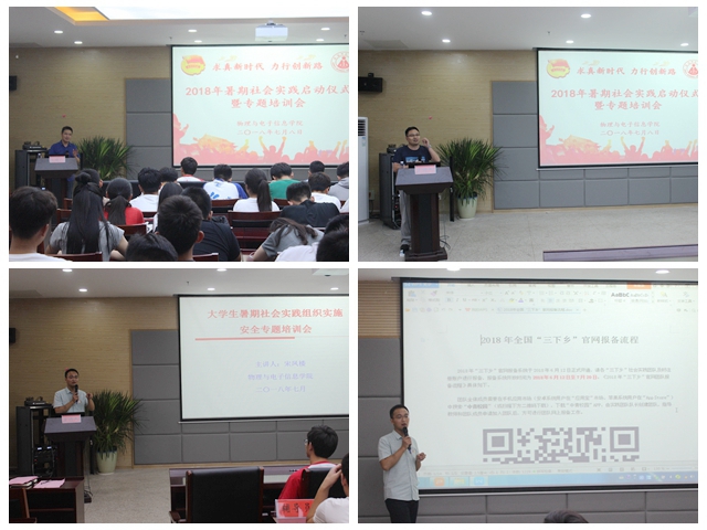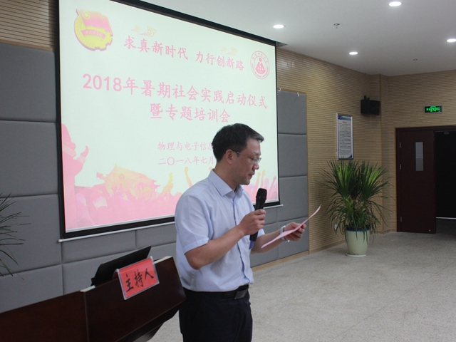 本网讯(院团委黄颖)求真新时代,力行创新路。7月8日下午,m88在理化大楼304报告厅隆重举行2018年暑期社会实践启动仪式暨专题培训会。校团委副书记汪凯,校教务处副处长崔光磊,暑期实践思政指导老师李新,公司党委书记李娟、副书记吴长义、副经理张其芳,指导教师代表丁绪星、汪志荣、刘小明、甘露,全体专兼职辅导员以及实践团队代表参加了启动仪式。仪式由院团委负责人宋凤楼主持。