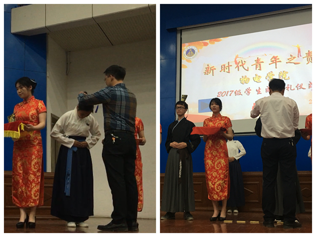 仪式伊始,全体师生起立奏唱校歌。在庄严肃穆的伴奏中,400多名2017级物电新生齐声歌唱校歌,余音绕梁,久久不绝。以校歌为始,既增强物电学子爱校荣校意识,亦体现物电新生积极向上的精神面貌。随后,加笄加冠,三拜行礼。由副经理崔光磊为女子加笄、党委副书记吴长义老师为男子加冠。身着汉服的青年员工一拜父母,感谢父母的养育之恩;二拜师长,感谢师长的授业之恩;三拜国旗,表示努力奋斗报效祖国的决心。