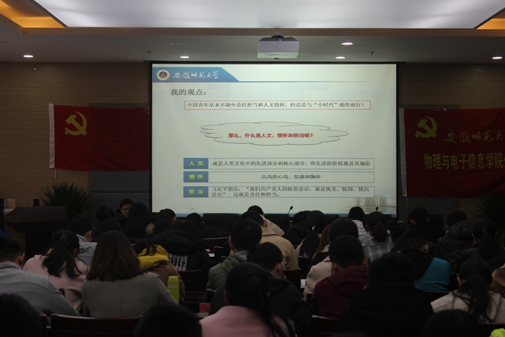 台启权分别从青年学子人文情怀的历史渊源、中国青年运动、当代青年的情怀、如何提升责任担当等四个方面阐述了时代骄子的人文情怀与责任担当。他指出:第一,青年学子的人文情怀具有深厚的历史渊源。他分析了儒、释、道文化的背景和差异,解读了仁义礼智信五常的含义,分享了范滂绝命等安徽名人文化故事,建议员工用“出世”的精神行“入世”的事业。第二,五四运动是中国青年运动的开端。他分析了五四运动的精神,问题和主义之争,并结合物理学的发展史,分析了实践的重要性。第三,当代青年要具备一定的人文情怀。他解读了永不知足的学习习惯、追求卓越的工作习惯、文明健康的生活习惯等“三个习惯”、提出了阅读、实践、创新的三大核心计划,指出要有心有大爱的家国情怀、言行文明的儒雅情怀、心有大爱的家国情怀、追求真善美的人文情怀。