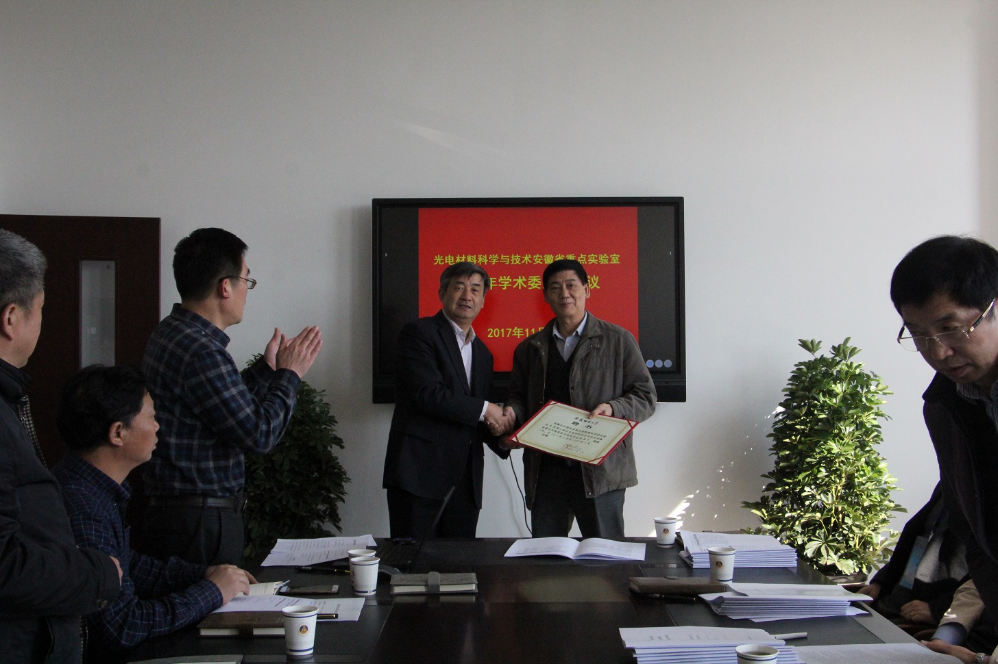 王绍武副董事长对出席本次学术委员会会议的各位委员表示热烈的欢迎和衷心地感谢,充分肯定了光电材料科学与技术安徽省重点实验室在科学研究、团队建设、人才培养等方面取得的成果,希望各位委员在重点实验室的建设过程中给予指导和帮助,承诺公司将在人力和财力方面全力支持实验室建设。并为第一届学术委员会委员及实验室主任颁发了聘书。