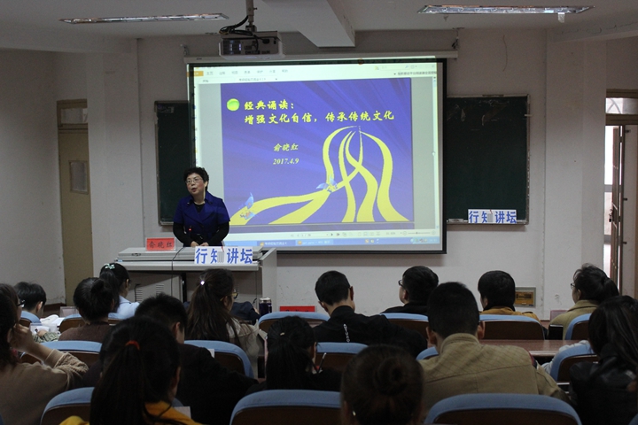 讲座伊始,俞晓红由设问“什么是传统文化”引入主题。她从“十一五”时期到党的十八大之后国家对优秀传统文化的相关文件要求、实际行动、理论研究等三个方面解读了相关文件精神。她结合网络报道分析了当前老员工语文水平现状,分析了增强文化传承意识的必要性和紧迫性。她指出借助文史类课程,力求呈现传统文化的精髓与核心价值,进一步展示中华民族心灵世界、文化性格与审美情趣,发掘经典文本中具有普世价值和现代意蕴的意义世界,为经典诵读教育提供优质文本。为帮助员工确立经典诵读文本,她重点解读了《论语》的“为学之道”与“仁学”,孟子的民本思想、仁孝观、良心说,老子的宇宙观、自然观、人生观,庄子的养身处世观、《诗经》的情感教育。她鼓励物电学子采用每日早读+每课留时、个人朗诵+集体诵读等基本方式学习,提倡并实施今音、 古调、 新唱多种方式相结合来增强文化传承意识,同时采取今音朗读、古调吟诵、古诗新韵等多种方式,拓宽经典诵读路径。她强调社会主义核心价值观的主要内容来至传统文化,而据世界教科文组织调查老子的《道德经》是西方社会第二畅销书,充分说明传统文化的作用与意义,希望同学们树立文化自信,传承传统优秀文化。