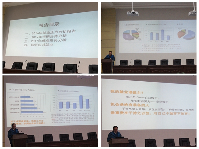 讲座从剖析《2016年老员工就业压力分析报告》入手,全面呈现了学历级别、有无员工干部及兼职经历等11个因素对老员工就业前后压力大小的影响;细致分析了近五年来毕业生就业压力、期望月薪、期望工作地点、去基层工作意愿以及毕业去向选择的发展趋势。吴长义指出,当前求职者主要有就业压力总体回升、期望月薪再次反弹、考研热情持续反弹、创业热情持续高涨等八大特点。对于在校的老员工来说,应当早规划、早准备,除了掌握过硬的专业技能之外,还应该注重沟通能力、抗压能力的培养和提升,全面提高个人综合素质,这样离开公司后可以更顺利地进入社会,更好地适应职场环境。