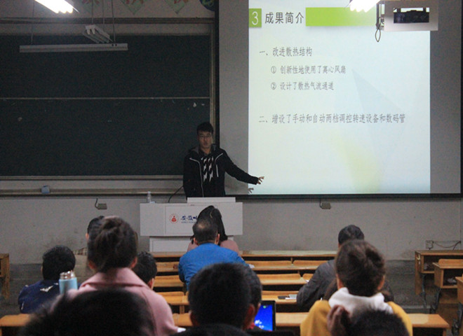 在现场,参与答辩的员工个个自信勇敢,胸有成竹,认真地向评委老师们展示了自己的成果。13物理的吴广成同学所研究的新型笔记本外接散热器改良了原来电脑固有的散热装置,采用了更为有效的方式,使笔记本散热装置的效率大大提高;13通信的张力、夏超所研究的多功能仓储搬运机器人能够实现多种功能,节省人力,具有很大的实用功效;14电子的王晓冉、黄莹对光学显微镜下图像自动对焦和图像自动识别系统的研究则取消了手动调焦带来的不便与麻烦,降低了仪器使用的操作难度;同时现场还有可以实时监控森林火灾的基于stm32的森林火灾监控四轴飞行器,节省能源的家用太阳能供电系统等等。每位参与答辩的同学都各显其能,拿出研究成果向评委展示自己的能力,可敬可佩。
