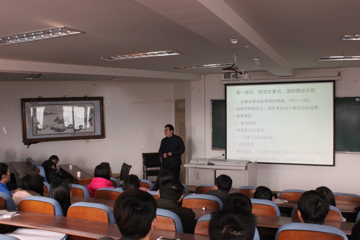 郑贤锋首先分析了国家及高校录取线的基本情况,对复试阶段的笔试、面试、心理测量等方面逐一做了介绍。他重点对复试的内容进行了分析,他提醒广大考生复试前可以多搜集一些报考专业的前沿动态、目标院校相关导师的论文,同时准备时要广泛涉猎,拓宽知识面,不可固守教材。对于调剂,郑贤锋提醒广老员工应认真复习,主动了解调剂信息,提升调剂成功的概率。会上,郑贤锋介绍了本院硕士点的发展历史、学科平台情况、导师队伍、研究生招生与培养方式,强调了调剂复试过程中的注意事项、复试科目与调剂要求,鼓励同学们珍惜前期考研努力的成果,积极调剂回公司,实现自己梦想。
