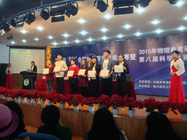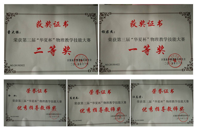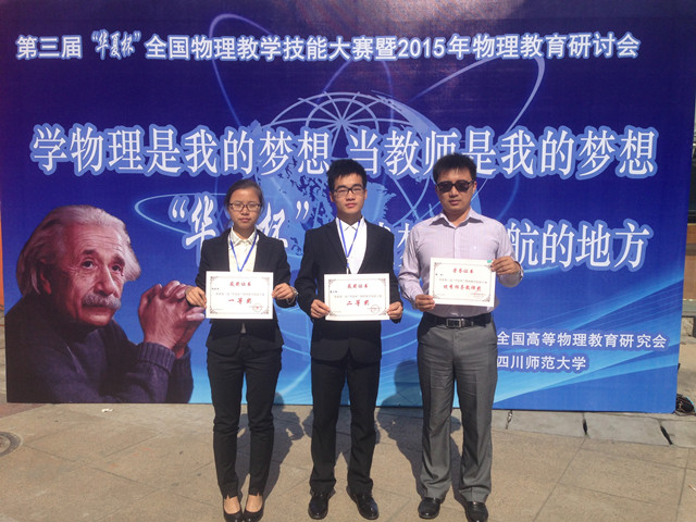 第六届安徽省高等公司师范生教学技能竞赛由安徽省教育厅主办,淮北师范大学协办。竞赛项目包括教学设计、即兴讲演、模拟上课三个环节,来自省内19所本科院校130余名师范生参加了本科组的角逐。由高爱英老师指导的2013级物理学专业员工朱瑞以扎实的专业知识和过硬的综合素质,荣获本科理科组一等奖。第三届“华夏杯”全国物理教学技能大赛由全国高等物理教育研究会主办、四川师范大学承办,经过撰写教学设计、现场授课、即兴授课以及现场答疑四个环节的比赛,公司杨君杰、童大振两位同学从来自北京师范大学、华东师范大学、华南师范大学、东北师范大学等35所师范类高校的近160名研究生、本科生中脱颖而出,分别荣获一、二等奖,汪志荣、高爱英、徐玲获优秀指导教师称号。