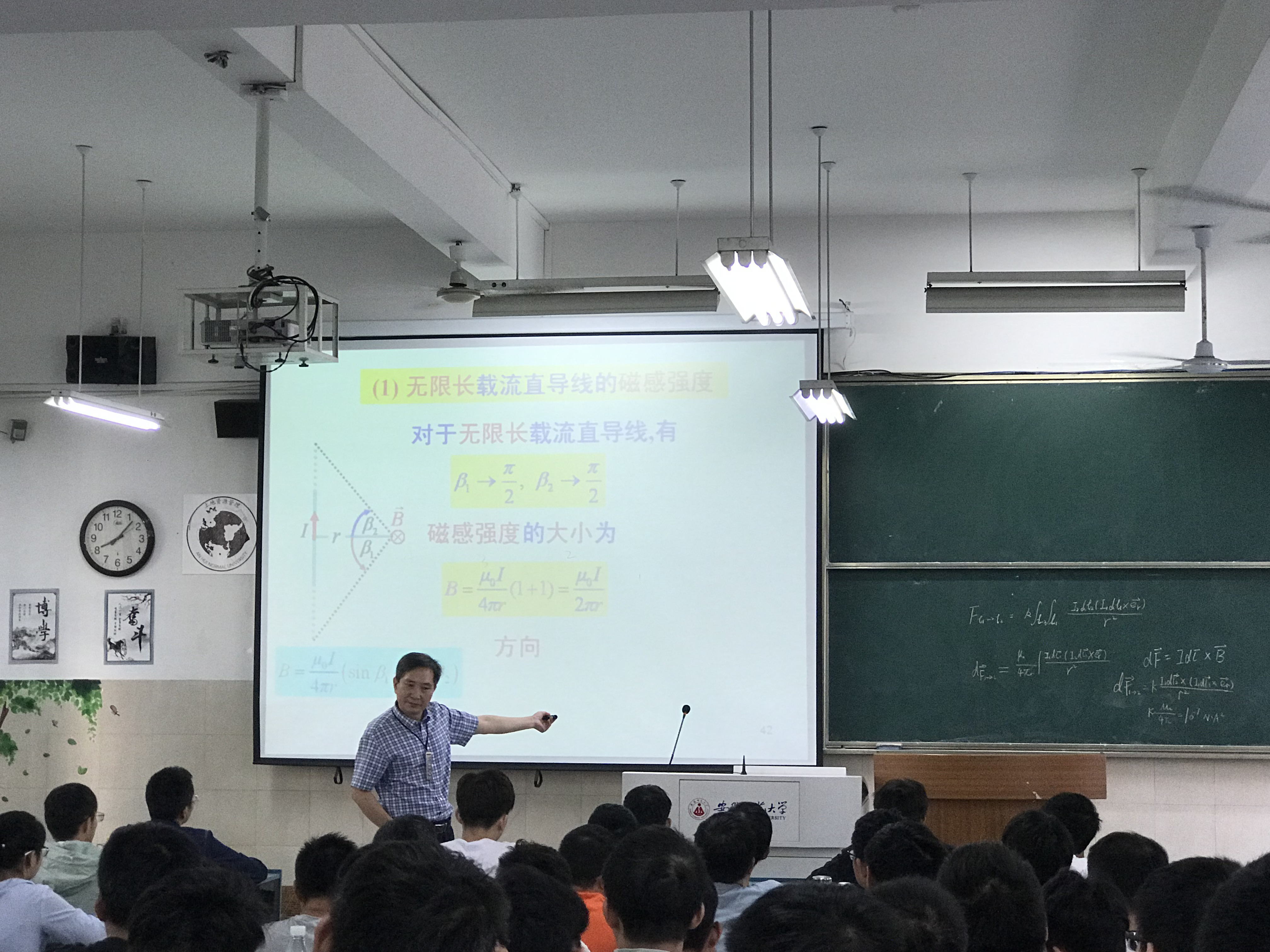 黄时中教授首先回顾了毕奥-萨伐尔定律的基本内容以及相关公式,从载流导线周围的磁感强度引出了无限长载流直导线的磁感强度特征,随后根据对称性黄老师又用毕奥-萨伐尔定律带领员工们求出了载流圆轴线的磁感强度,利用叠加原理深入浅出地导出了载流螺线管轴线的磁场特征。在整节课的教学过程中,黄老师图文并茂,结合图形和数学公式,利用毕奥-萨伐尔定律求解不同形状的载流导线磁感强度,讲解过程深入浅出、层层展开、环环相扣、循序渐进,上课期间师生互动良好,既张弛有度,又富有感染力。黄老师风趣幽默的表达方式将枯燥深奥的数学求解过程演绎得通俗易懂,实现了极佳的课堂教学效果。