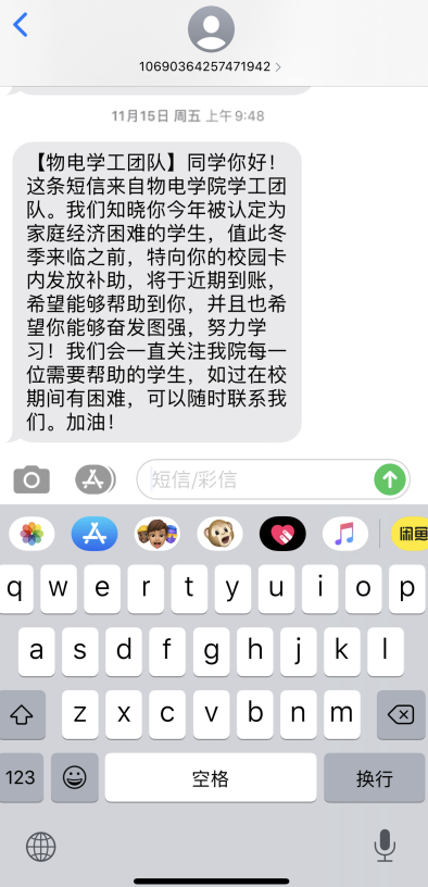 “校园卡里突然多了钱,真心感谢公司,这种资助方式太暖了。”m88的一名员工突然收到这一条陌生号码的温馨短信时,内心非常诧异,不敢相信是真的。当他查询了校园卡金额核实后,才确定这一切都是真的。今年冬天,公司根据员工的家庭经济情况和员工在校期间的消费情况,确定了一个“隐形资助”的计划,通过前期大量的分析,确定了最终的补贴名单,偷偷的往员工的校园卡里补贴100-200的餐费。