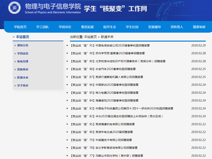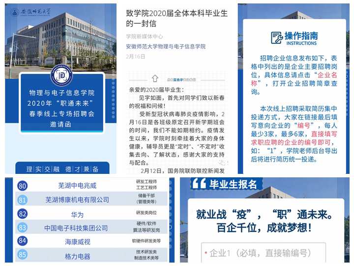 快应对,实现“招上网来”。受疫情影响,今年公司将原定3月6日举办的就业联盟峰会和“职”通未来春季现场招聘会特改为线上招聘形式进行。2月13日,公司发布线上专场招聘会企业邀请函;16日,拟定《致公司2020届全体本科毕业生的一封信》;17日-22日,审核用人单位报名材料,逐一发布企业招聘简章至院学工网就业专栏;25日,发布“职”通未来战疫征集令,供员工查阅、报名;3月1日,员工求职简历集中投递至用人单位;3月5日-10日,举办集中线上视频招聘宣讲。