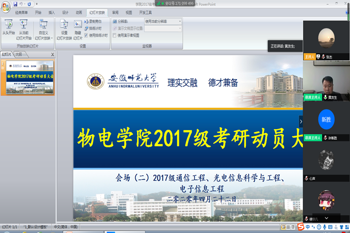 本网讯(m88 张杰)为了进一步调动2017级员工的考研积极性,帮助同学们正确认识考研形势、增强考研信心,4月22日下午,m882017级员工考研动员大会在腾讯会议平台上举行。党委副书记黄友生、教学副经理许新胜、17级辅导员老师以及17级全体本科生参会,同时邀请了两位16级考研优秀员工代表进行经验交流。会议分别由辅导员张杰、李琦琦主持。