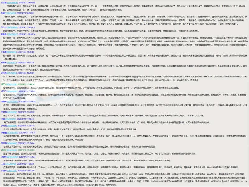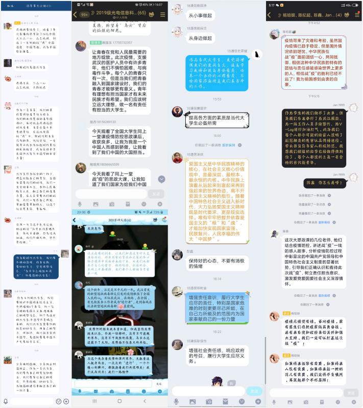 线上研讨强化担当。这堂战“疫”思政大课在全院师生中产生热烈反响,课程直播结束后公司积极引导师生进行线上研讨。辅导员们谈到,“当前疫情防控取得积极良好成效,全国大中小学陆续开展返校工作,在这样的时刻深入学习了一堂战“役”思政大课,进一步坚定了战胜疫情的信心,增强了听党话、跟党走的情感认同,同时强化了作为青年学子的使命担当,为未来的学习生活指明了方向。高校辅导员要将高校思想政治理论课教学优势转化为支持防疫斗争的强大力量,引导广老员工树立正确的世界观、人生观、价值观,将个人成长成才的梦想融入到中华民族伟大复兴的中国梦中,与员工共担使命,共同成长。”2017级自动化专业魏潘晨说到:“一张张留下医疗护具深深痕迹的脸庞让我感动,一份份按满红指印的请战书让我震撼,在这场没有硝烟的战争中他们为青年人树立了良好的榜样,向我们展现了当代青年的责任和担当。在赋予了朝气、活力、拼搏的美好青年时期,我们应当有凌云壮志的想,更要有脚踏实地的行,我相信当我们这一代手握中华民族伟大复兴的接力棒时定能担当时代的重任,砥砺前行。”2019级电子信息类霍雅娜说:“ 白衣战士的逆行,让我们看到了无数平凡而伟大的身影。在疫情防控期间,泪水,悲伤,感动,温暖,坚强,执着,拼搏,担当,无畏,英勇,这些情感记忆,都将成为我们共同的烙印。而现在,终于迎来春暖花开,沧海横流显砥柱,万山磅礴看主峰。我终于深切体会到了‘哪有什么岁月静好,只是因为有人替我们负重前行’这句话最真实的意义。唯有将青春岁月与祖国人民相连,求真力行,勇于担当,才能书写‘大写’的人生篇章!”