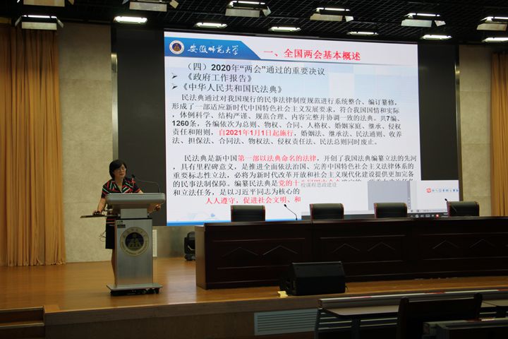 李娟从全国两会基本概述、政府工作报告要点、习近平的讲话精神、贯彻落实两会精神等四个方面进行了详细解读与分析,对《中华人民共和国民法典》和《全国人民代表大会关于建立健全香港特别行政区维护国家安全的法律制度和执行机制的决定》有关内容及其重大意义进行了全面阐述,重点解析了政府工作报告中今年发展的目标任务、重点工作以及两会期间习近平总书记在参加相关代表团审议时的重要讲话精神。李娟指出,会议期间,习近平总书记多次发表重要讲话,强调坚持人民至上、生命至上,强调时刻绷紧疫情防控这根弦,强调坚决夺取脱贫攻坚战全面胜利,强调用全面辩证长远眼光分析经济形势,强调保持加强生态文明建设的战略定力,强调力戒形式主义、官僚主义等,具有很强的政治性、思想性、针对性和指导性,对于坚定中国信心、凝聚奋斗力量意义重大。就贯彻落实两会精神,李娟强调要让两会精神在公司真正落地生根,希望全体党员、全体教职工高度重视,认真做好疫情防控工作;千方百计,抓好毕业生就业工作;精打细算,必须真正过紧日子;注重质量,推进一流专业、一流团队建设;科学谋划,认真编制“十四五”事业发展规划。