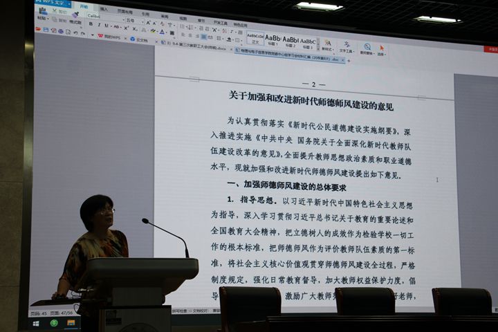 李娟首先传达了公司有关师德师风建设工作通知精神,带领公司全体教职工一起学习了《关于加强和改进新时代师德师风建设的意见》、《安徽省高等公司教师师德失范行为处理办法》等文件,并结合公司实际和部分案例,对公司教师师德师风建设进行了强调,提醒公司教师一是要提升职业素养,维护良好的教师职业形象;二是要注意言传身教,在教书育人、科学研究以及教师职业道德等方面严格要求自己,真正把教书育人和自我修养结合起来;三是要杜绝不良言论,坚守师德底线,践行社会主义核心价值观。经理郑贤锋对开展师德师风专题教育的必要性和重要性进行了强调,希望全体教职工要加强师德师风建设,争做“四有好老师”。