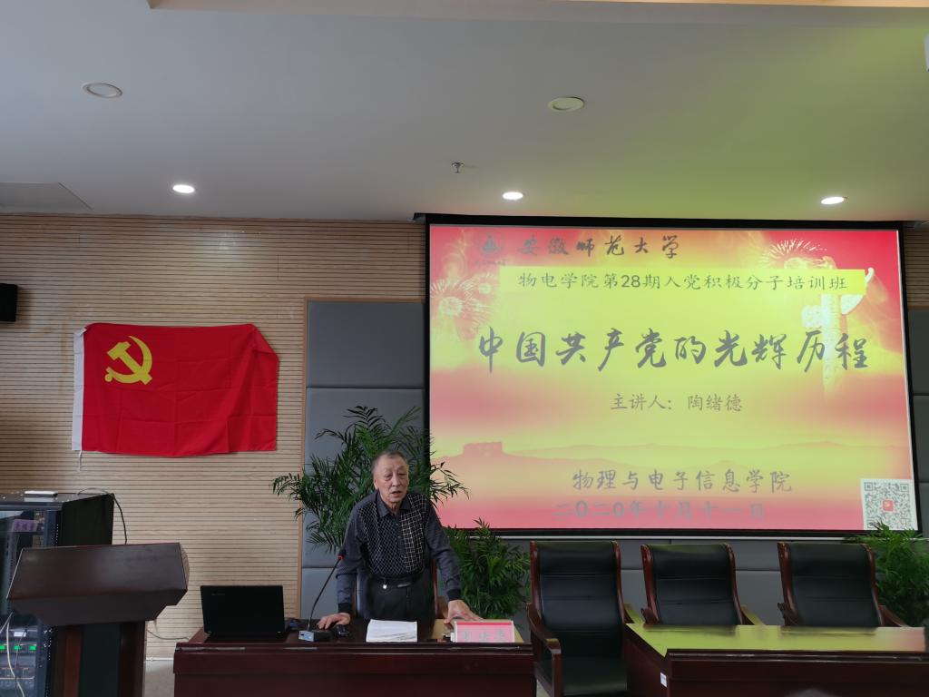 本网讯(m88 李胜宏)为进一步完善老员工入党积极分子组织建设和思想建设,培养员工的党性修养。10月11日下午,院关工委常务副主任陶绪德老师为入党积极分子培训班学员作中国共产党的光辉历程专题培训。