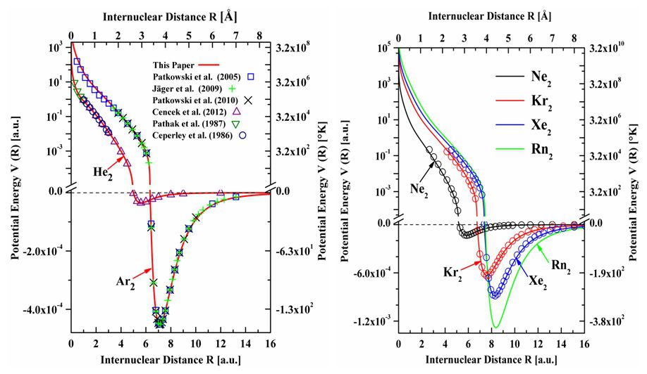 稀有气体族原子间相互作用主要来自非常弱的色散能,其物理机制为瞬态偶极与诱导偶极间相互作用(非定域的电子间关联效应),相较于其它类型的原子间相互作用在计算上更为复杂,这为基于量子力学基本原理的从头计算方法带来了一定的困难。如何快速获得此类体系高精度的原子间相互作用势一直以来都是原子与分子物理及其相关领域的热点和难点课题之一。