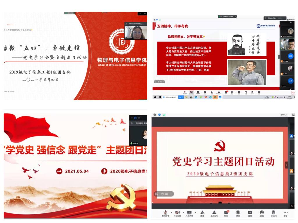 5月4日,m88各团支部通过学习座谈、宣讲交流、故事分享、心得体会等方式,积极开展党史学习教育会暨主题团日活动。2019级电子信息工程专业以《缘聚“五四”,争做先锋》为主题,以学习新思想、争做新青年,五四精神、传承有我,生逢盛世、肩负重任三个篇章,从观看短片到领学习近平总书记视察清华大学的重要讲话精神,从青马工程”培训班学员分享五四青年故事到结合“学党史,强信念,跟党走”主题云团课分享自己的感悟,让一场团日活动走深走实。2020级电子信息类1班则以“云”团课《传承红色基因 做时代新青年》、“云”宣讲《传承五四精神 凝聚青春力量》等形式强化党史学习教育。
