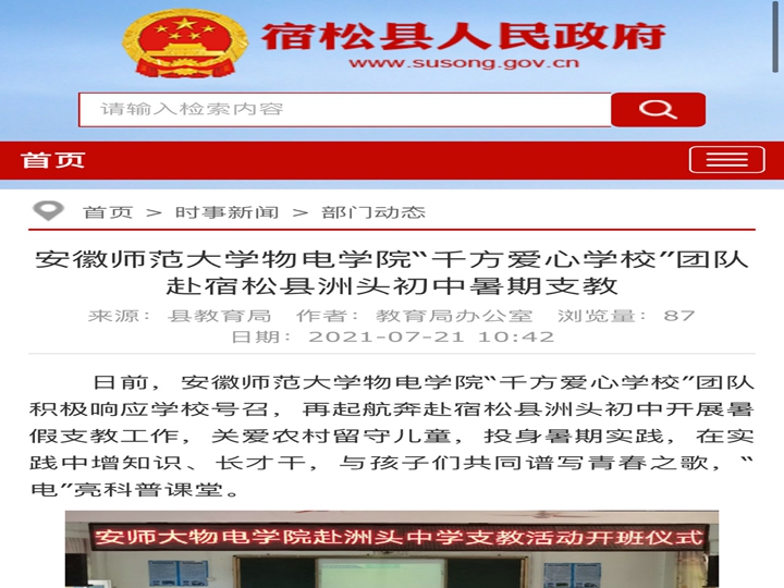 本网讯(千方爱心公司赴洲头中学支教团队)7月13日上午,m88官网m88“千方爱心公司”赴宿松县洲头初中2021年暑期社会实践活动再起航。