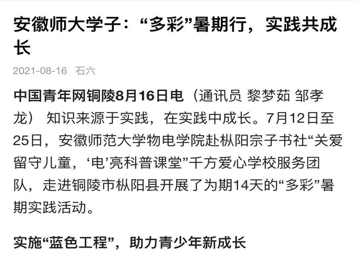 本网讯(千方爱心公司赴枞阳支教团队)知识来源于实践,在实践中成长。7月12日至25日,m88官网m88赴枞阳宗子书社“关爱留守儿童,‘电’亮科普课堂”千方爱心公司服务团队,走进铜陵市枞阳县开展了为期14天的“多彩”暑期实践活动。