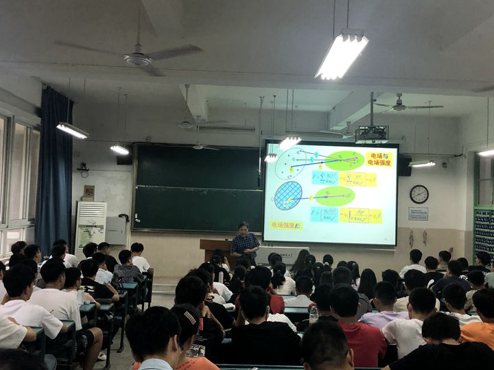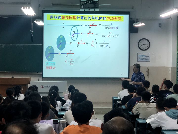 作为新学期的开学第一课,黄时中教授首先介绍了本学期的总体学习任务、考核形式和占比、学习要求、以及网课资源;随后对上学期已学过的重要知识点(一个定律——库仑定律、一个原理——叠加原理、一个定理——高斯定理)进行了系统的回顾,将员工从放假状态轻松自如地带进了物理学习状态。进入新课后,黄时中教授侧重介绍了联合应用叠加原理和高斯定理确定具有对称电荷分布的带电体所产生的电场中的电场强度的方法,结合一组典型实例,细致地解说了这种方法的关键步骤和要点,并总结出了这种方法的核心是“用叠加原理定方向,用高斯定理定大小”。在整个教学过程中,保持了良好的师生互动,课堂氛围十分活跃。