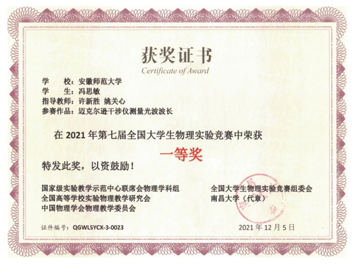 自备赛活动启动以来,教务处和m88都高度重视,精心组织了多轮培训打磨。经过初审、网上评审、线上决赛答辩等环节的重重考验,最终,许新胜、姚关心、金伟、彭雪城等老师指导的讲课类《迈克尔逊干涉仪测量光波波长》项目获全国一等奖、《杨氏模量的测定》项目获全国三等奖。另外,我们公司在自选类《简单电路演示仪》项目获得优秀奖。