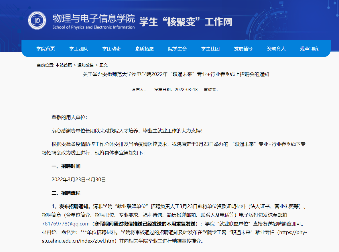 据悉,目前正值公司2022届毕业生求职关键时期,此次线上招聘会,是公司应对新冠疫情影响推出的优化就业模式、拓宽就业渠道等多项稳就业、促就业措施之一。目前公司已分专业建立2022届毕业生去向信息库,动态更新、实时掌握、精准服务;组织动员全院教师为毕业生提供复试指导、调剂参考、就业推荐,力争实现“求职择业不延期,就业服务不断档”。