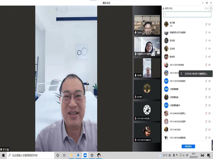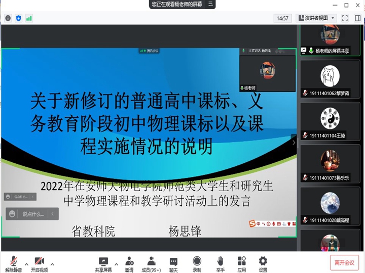 为推进教师教育实践课程教学改革,进一步提升师范生公司产品能力,5月21日-22日,由校教务处主办、m88承办的《班级管理指导与训练》课程暨师范生公司产品能力提升系列讲座通过线上腾讯会议形式成功举办。校教务处副处长、创新创业公司副经理李汪根,m88教学副经理张爱清,物理教师教育研究室主任汪志荣分别主持了讲座。公司2019级物理学师范专业全体员工和学科教学(物理)专业研究生,及其他有关师范专业的师生近200人参加了系列讲座活动。