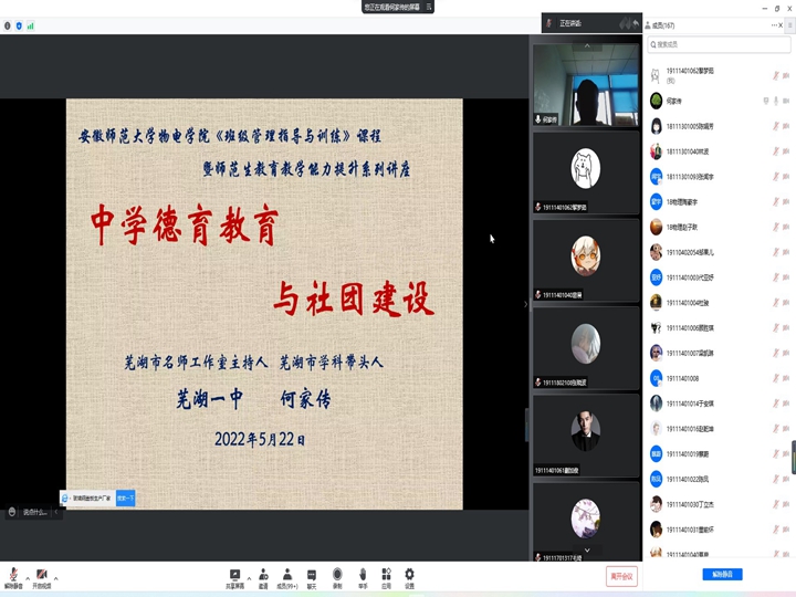 5月22日上午,何家传以《中学德育教育与社团建设》为题从“初心:做一位好老师——育人先立己”、“使命:立德树人,促进员工全面发展”、“实践:提升班主任胜任力,追寻生命共同成长”、“感悟:班主任的专业素质是做好班主任工作的重要基础”四个方面内容向同学们阐述如何进行中学德育教育,同时又结合芜湖一中开展丰富多彩的特色活动向同学们介绍如何做好中学社团建设。