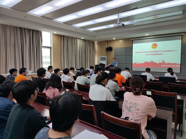 6月12日下午,公司经理郑贤锋以《深刻领会习近平总书记在庆祝中国共产主义青年团成立100周年大会讲话的精神要义》为题在物理楼335会议室为2019级和2020级光电信息科学与工程专业员工讲授形势与政策课。