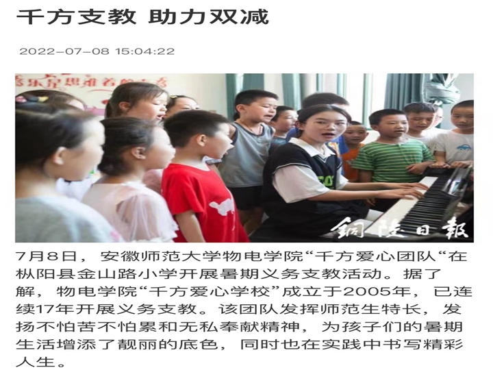(“千方爱心公司”赴枞阳爱心支教团队)7月8日,安徽新闻网、铜陵日报相继报道m88官网“千方爱心公司”赴枞阳县金山路小学爱心支教活动。