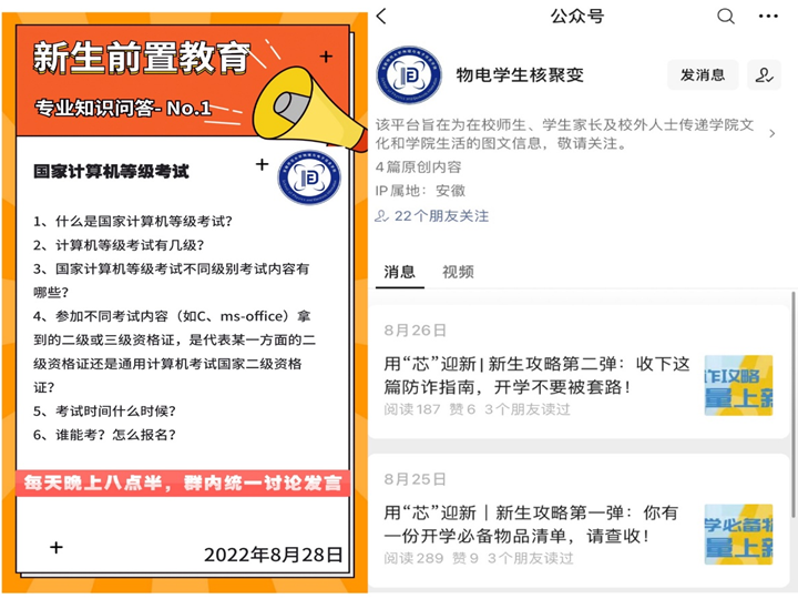 夏日来信,不负久候。《致m882022级新生的一封“家书”》随着录取通知书,带着祝福和希望跨越万水千山,送达2022级物电学子手中。为便于新生同学更加清晰相关入学事宜,公司提前谋划,在“家书”最后附录上电子信息类、物理学(师范)、物理学(拔尖班)、自动化相应专业官方QQ群号,让各位同学实现未到校、先入班,未谋面、先交流。同时选拔多位优秀高年级导生进入QQ群,利用线上平台开展朋辈交流,针对新生关注的校园生活、专业认知、学科竞赛等问题,进行多渠道交流,营造温暖和谐氛围。新生辅导员针对新生专业发展精心设计每日专业知识问答环节,通过“查阅-思考-问答”的方式引导员工带着问题独立思考,引导新生为提前到来的大学学习生活打好基础。公司微信公众号“物电员工核聚变”,特别推出“用“芯”迎新”系列推文,内容以满足员工切实所需为落脚点,提醒新生必备的开学物品和提高防诈骗意识等内容,增强服务员工的针对性和实效性。