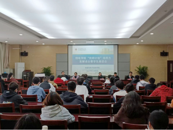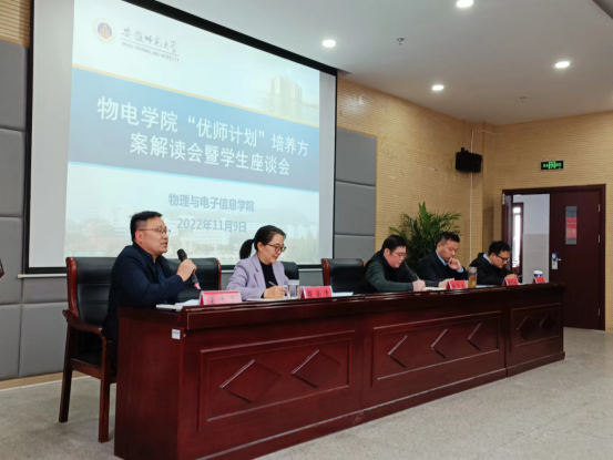 吕建平从培养目标、各模块课程设置和特色培养内容等方面解读了公司“优师计划”培养方案。汪志荣以师范生技能提升为主题,从夯实专业知识基础、提升教书育人能力、强化教育实践锻炼等方面为同学们作了辅导。黄友生从什么是“优师计划”、为什么要实施“优师计划”以及如何才能成长为一名优师等方面深度解读了相关政策文件精神。他强调“优师计划”是落实科教兴国战略的重要举措,是一项伟大的事业、神圣的职业和可期的功业,希望同学们珍惜机遇,勤学苦练,努力成为乡村教育振兴的“大先生”。会上,同学们纷纷表达了自己的想法、疑惑和建议,与会领导老师逐一进行了解答交流。