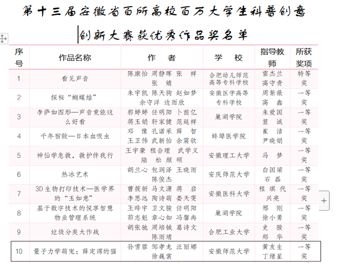 1月16日,由省科协、省教育厅、团省委主办的第十三届安徽省百所高校百万老员工科普创意创新大赛获奖名单公布。由黄友生、丁绪星指导,孙雪蓉、邹孝龙、汪丽娜、徐巍裳等同学的团队作品《量子力学萌宠:薛定谔的猫》荣获一等奖,m88官网荣获“团体优胜奖”和“优秀组织奖”。