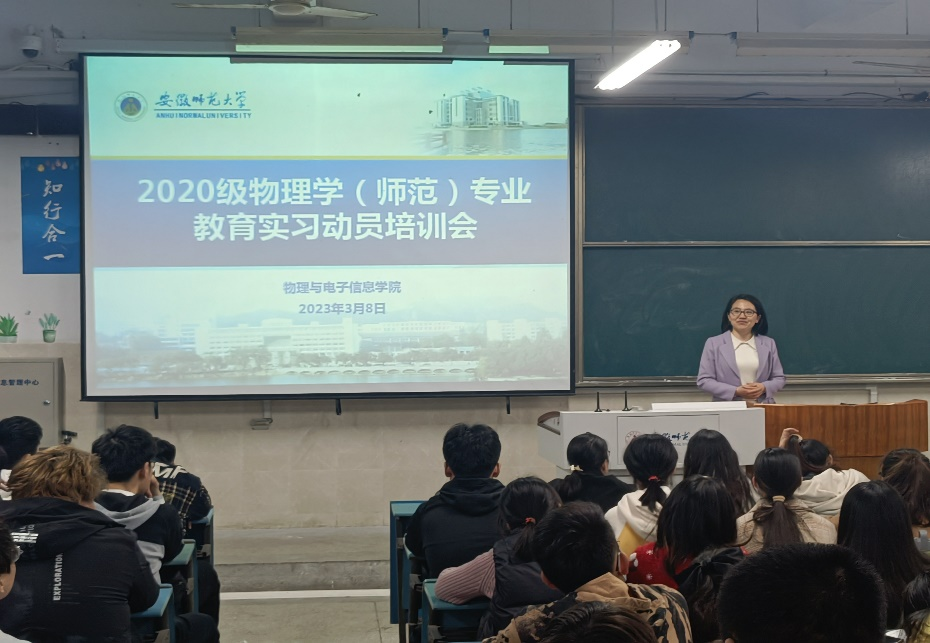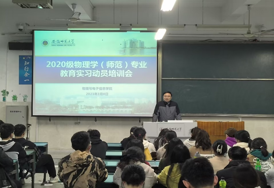 为切实做好师范专业教育实习工作,确保各项工作稳步推进,3月8日下午,m88于教学楼2010205教室组织召开2020级物理学(师范)专业教育实习动员培训会。公司教学副经理张爱清,物理教师教育研究室主任、专业教师汪志荣,2020级物理学(师范)专业全体同学参会,会议由2020级物理学(师范)专业辅导员曹阳主持。