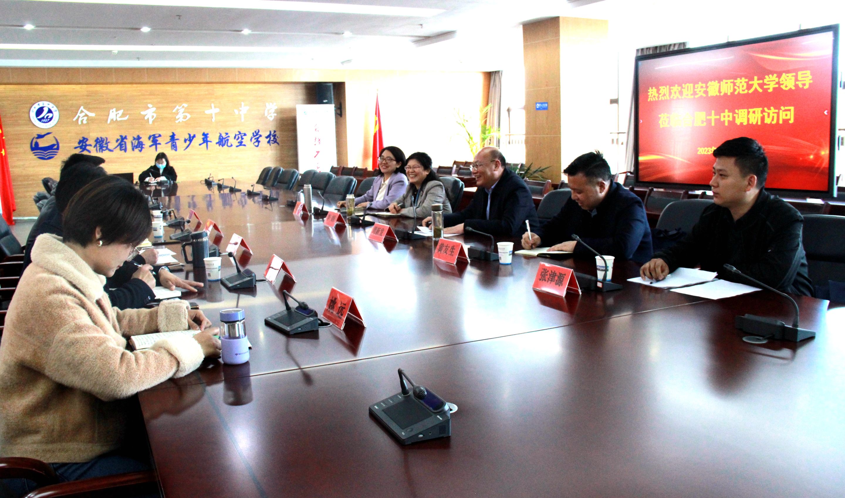 3月13日下午,周新发一行来到了合肥市第十中学开展交流,合肥十中董事长姜际龙、副董事长王锋等参与座谈会。会上,合肥十中教务副主任姚远介绍十中基本情况、在校工作师大毕业生发展情况、师大实习生实习等情况。双方围绕师范生培养与就业等问题开展了具体交流。会后,周新发一行还参观了合肥十中海军航校的航空文化馆。