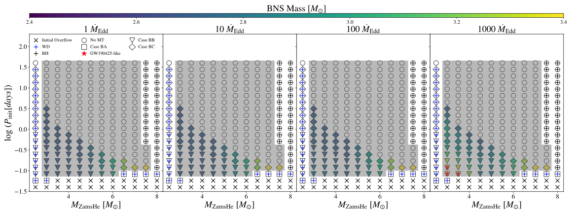 张莞婷同学一直对天文学有着浓厚的兴趣,依托“大创”项目,通过学习和熟练使用细节双星演化数值模拟工具MESA,借助​m88的算法服务器,长期开展了近1000多个双星系统演化的数值模拟,搜寻可以形成GW190425的演化渠道,成功发现在1000倍超爱丁顿吸积下大质量中子星系统生存的参数空间。研究还计算出该双中子星系统在形成之后可以通过引力波辐射最终并合成一个黑洞,对约束中子星的质量上限以及理解特殊引力波源的形成机制具有重要的科学价值。