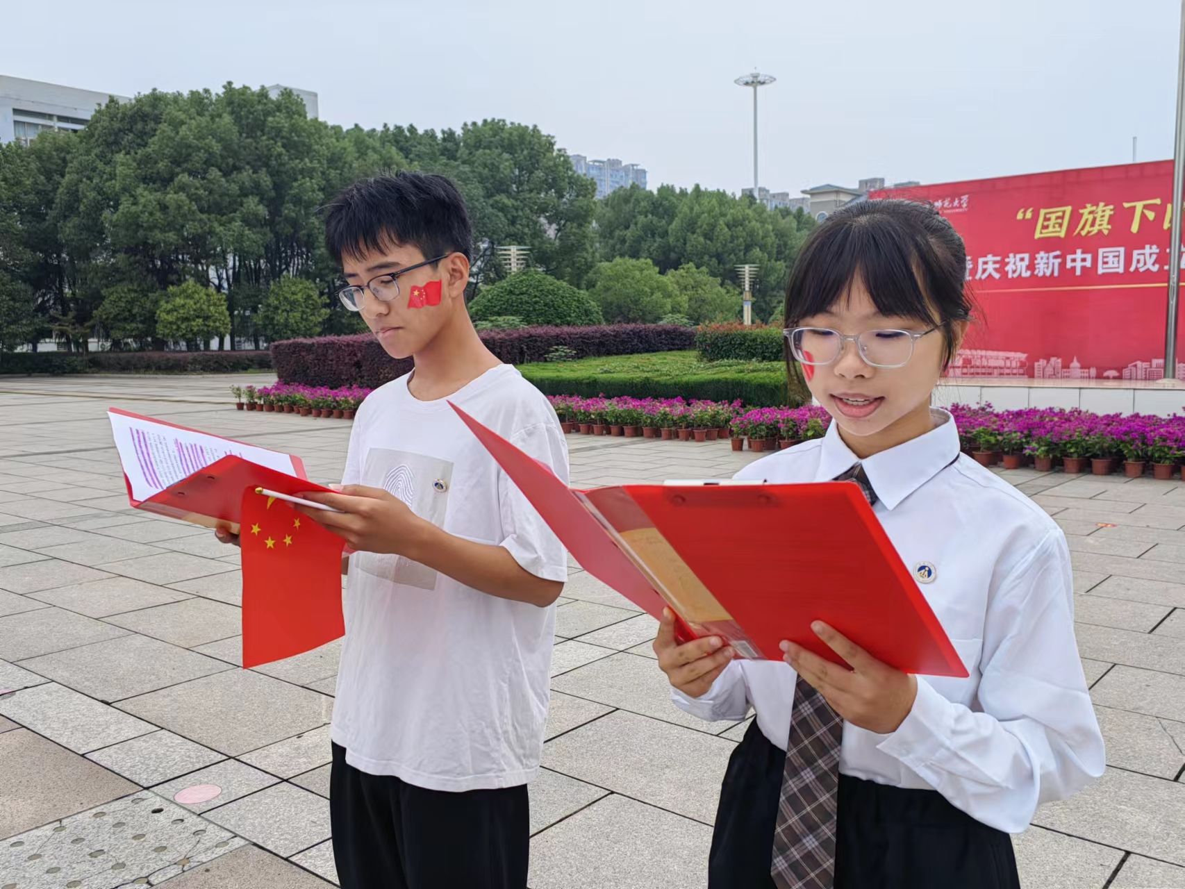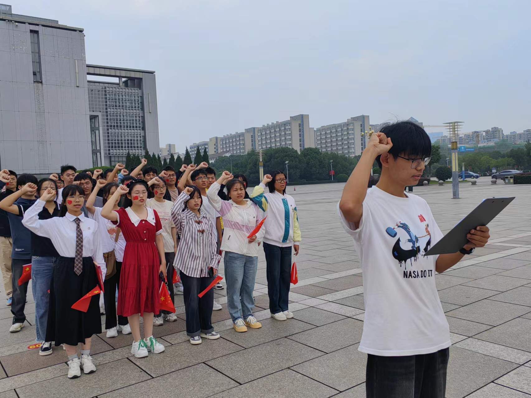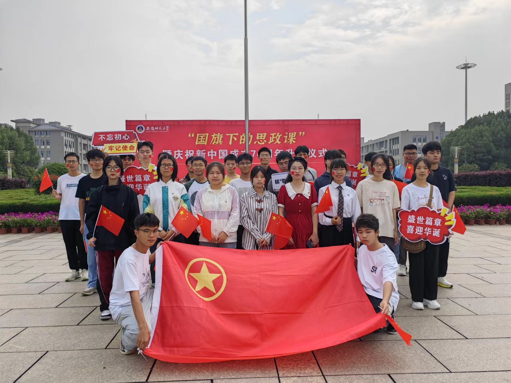 为隆重庆祝中华人民共和国成立74周年,引导广大学子厚植家国情怀、坚定理想信念、勇担时代使命,争做四有好青年,m88于10月1日上午,在敬文图书馆东广场举行庆祝国庆74周年主题团日活动。公司辅导员张月停老师、魏潘晨老师,以及国庆假期留校的各年级员工参加了本次活动,活动由魏潘晨主持。