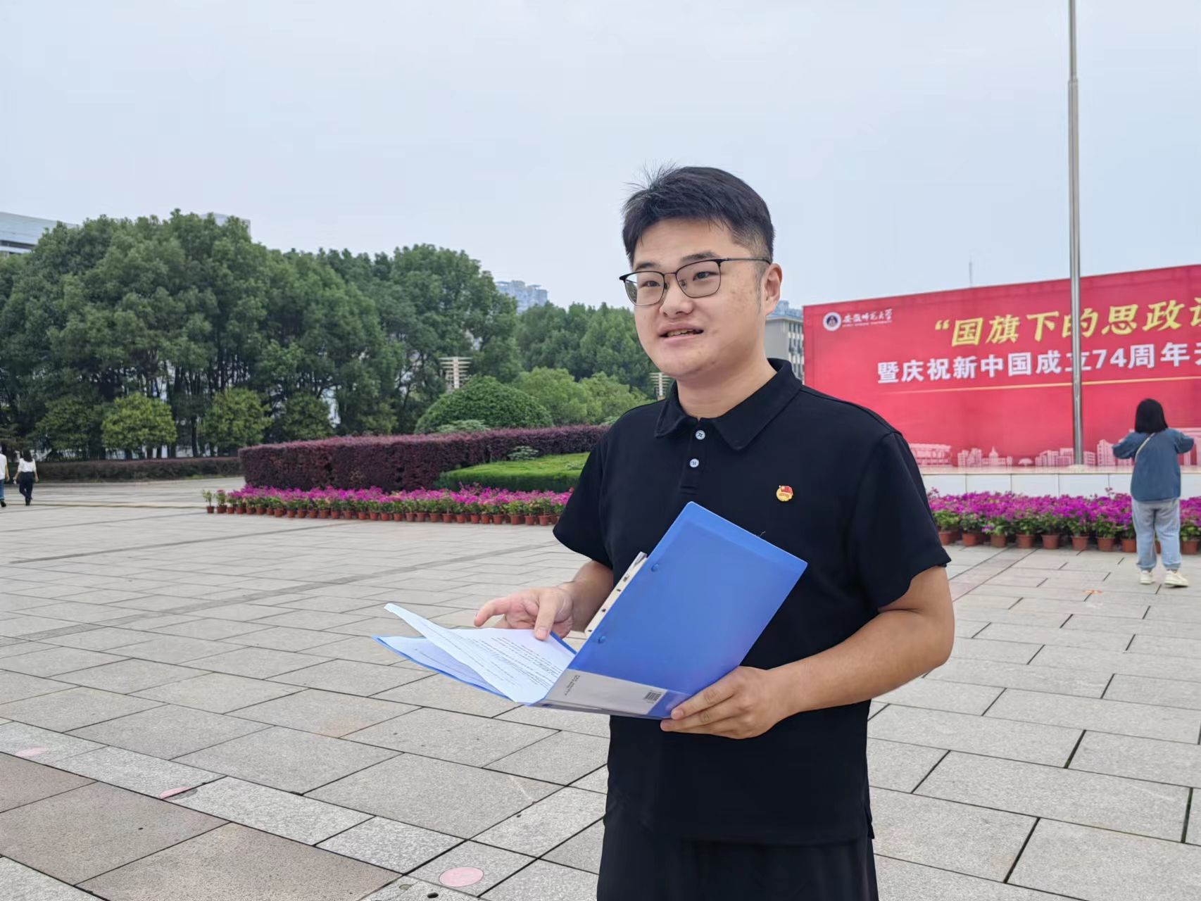 2023级物理学师范专业的吴冰冰和宋奥杰同学作为员工代表做了国旗下宣讲。他们用我国北斗卫星导航系统工程副总设计师谢军同志的感人事迹,激励同学们努力学好自身专业,不断培养创新意识,踏实躬身科研事业,将来把自己的所学所创都书写在祖国大地上,以实际行动为祖国的建设添砖加瓦。在两位同学声情并茂的演讲里,团员们感悟着科研前辈的心路历程和家国情怀,一颗颗红色的种子在每一个学子心里生根发芽。